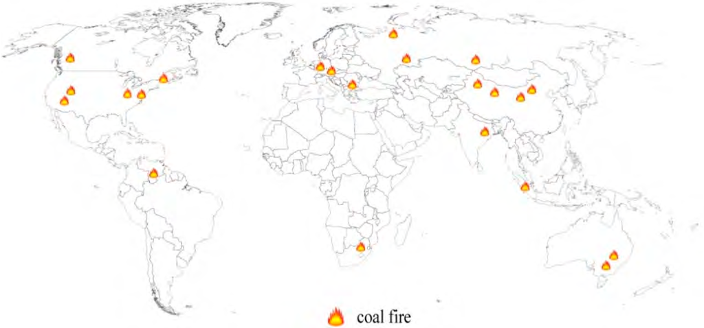 Surface and underground coal fires have received great attention from researchers due to the threats they pose to non-renewable resources, local environment and regional climate. These uncontrolled fires are a common problem and are widely reported from most coal-bearing countries of the world, such as the USA, China, India, Australia, Russia, South Africa and Indonesia, among others (see Figure 1) [,,,,,,,,,,,,,]. For China, which is the world’s largest coal-producing and coal-consuming country, approximately 10–200 Mt of coal reserves are consumed or made inaccessible for further mining operations due to coal fires (see Figure 2) [,]. In addition to the obvious economic losses of the waste of valuable coal resources, these coal fires have also led to health risks and environmental damages for the affected regions [,,,,,].