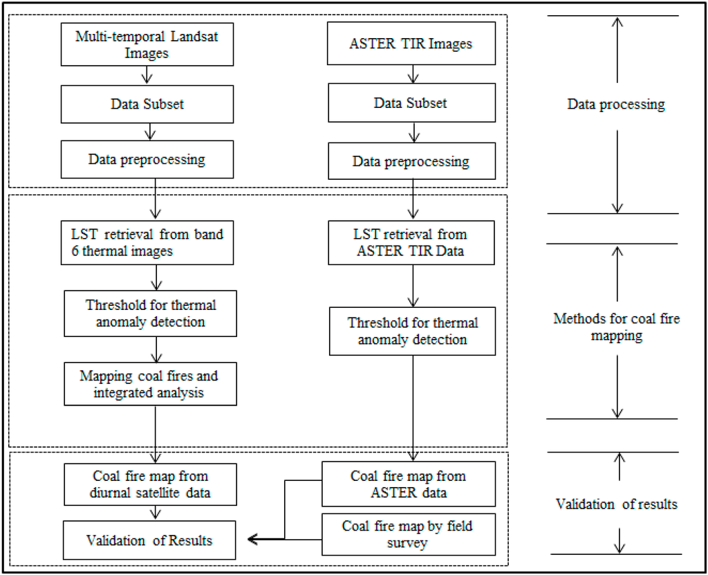 Various methods for detecting and monitoring coal seam fires using thermal infrared remotely sensed data have been developed. A density slicing method was successfully applied to extract coal fire information from Landsat-5 Thematic Mapper (TM) data [,,,,]. Two complementary automated thermal anomaly extraction algorithms were presented to automatically delineate coal fire risk areas from multispectral satellite data and to automatically extract local coal-fire-related thermal anomalies from thermal Landsat TM and Enhanced Thematic Mapper (ETM+), Advanced Spaceborne Thermal Emission and Reflection Radiometer (ASTER) and Moderate-Resolution Imaging Spectroradiometer (MODIS) data []. The dual-band Dozier method [] and the multi-temporal analysis method have been used by many researchers in recent years [,]. Other methods, such as the contextual method and fuel mask method, have also been used for coal fire detection [].