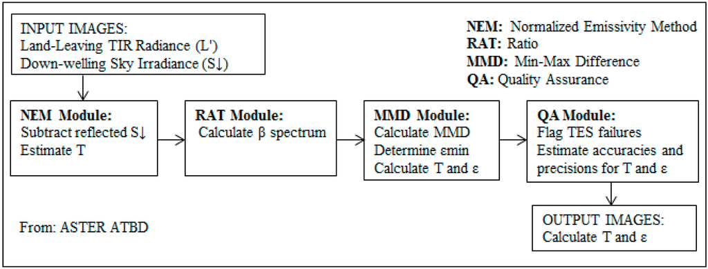 The multi-spectral sensor ASTER onboard the National Aeronautics and Space Administration (NASA) Terra satellite has five channels in the thermal region (8.125–8.475 μm, 8.475–8.825 μm, 8.925–9.275 μm, 10.25–10.95 μm, and 10.95–11.65 μm), which provides an opportunity for scientists to directly estimate emissivity and temperature from the remote sensing data. Recently, researchers have developed several methods for extracting emissivity information from the ASTER imagery, including the TES algorithm, Emissivity Normalization Method (NEM), alpha-derived emissivity method and Reference Channel Method (RCM) []. To validate the results that were derived from the multi-temporal Landsat TM/ETM+ thermal band 6 data, we used the temperature products that were derived from the ASTER data using the TES algorithm that was developed by the ASTER research team. The TES algorithm was developed by Gillespie et al. [] to retrieve temperatures (with an accuracy of ±1.5 K) and emissivity (with an accuracy of ±0.015) from the TIR bands of the ASTER imaging radiometer. The TES algorithm combines three algorithms that are linked together, as shown in Figure 4.