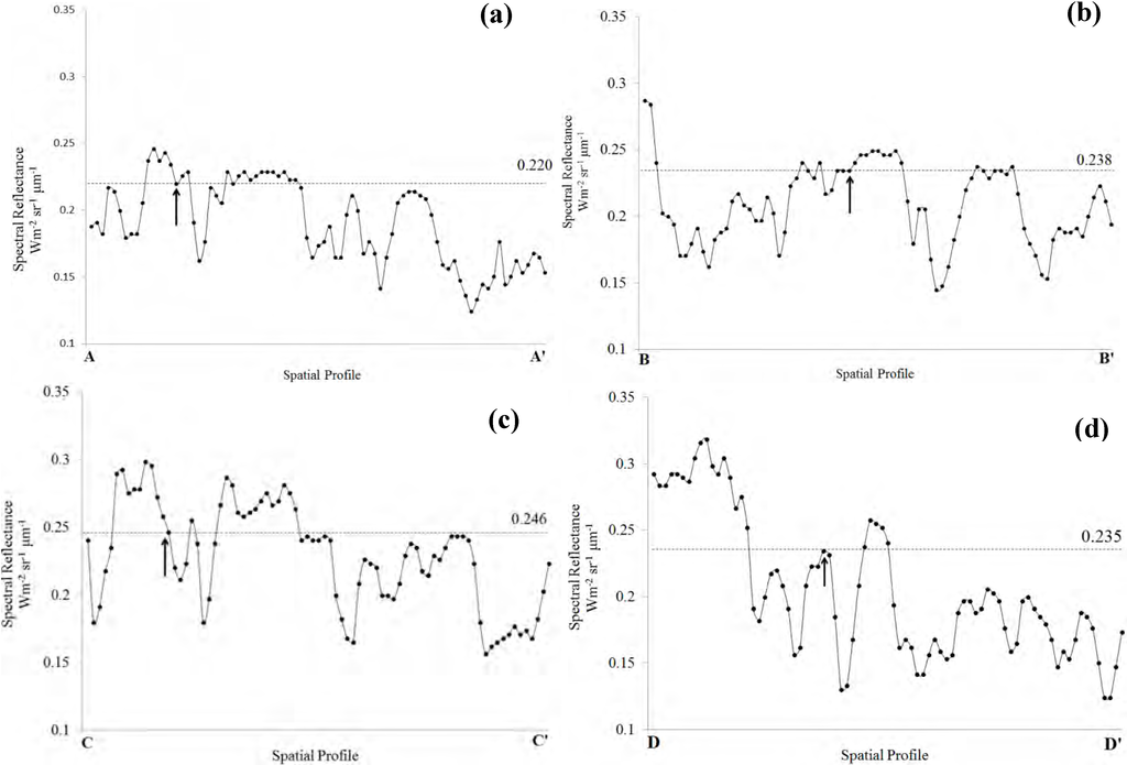 To determine appropriate threshold to delineate the coal overburden dump to remove these wastes, field survey work was carried out from 6 July 2003 to 15 July 2003 by the Shenhua (Beijing) Remote Sensing (SBRS) Co. Ltd. and the local Wuda Coal Mine Bureau under the co-project under the frame of the Sino-Germany Dragon Program. Selecting the closest-to-the-field-survey-time Landsat TM image, the spatial profiles AA’, BB’, CC’, and DD’ were drawn across the 3 May 2003 image (see Figure 5). For these four profiles (AA’, BB’, CC’, and DD’), the spectral reflectance value along these profiles and the respective maximum reflectance are shown (see Figure 6a–d).