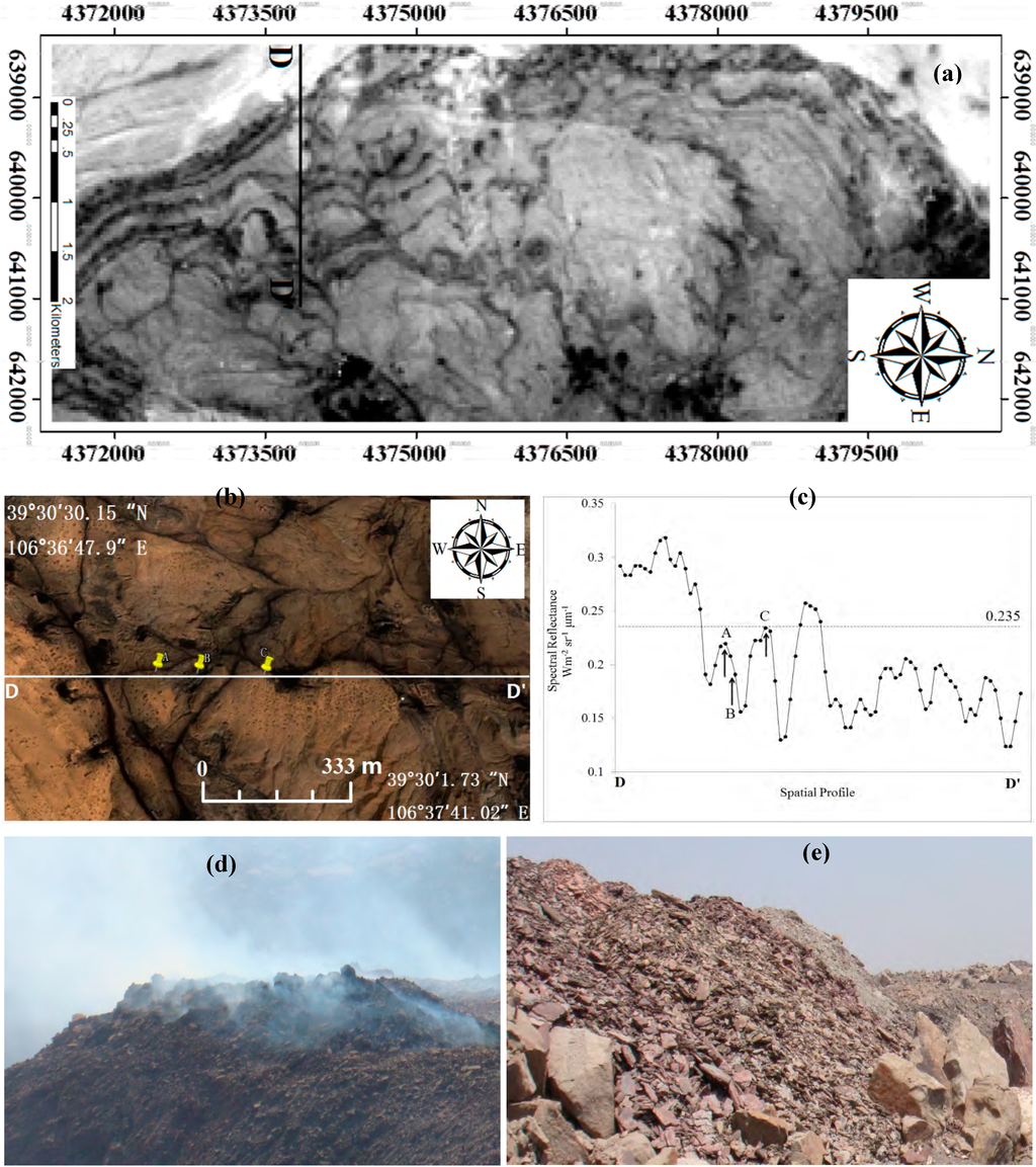 The WCF area is mostly an open-cast mine area, and the various ground features are often overburden coal dumps, underground coal fires and some scattered surface coal fires. Among these ground features, the overburden coal dumps had the highest reflectance value (see Figure 7). Therefore, taking the spatial profile DD’ as an example (see Figure 7(a)), with the help of the image from 5 Oct. 2003 from Google Earth TM (see Figure 7(b)) and the field survey photograph (see Figure 7(d) and 7(e)), the pixel corresponding to the overburden coal dumps can be marked and delineated with the determined threshold (see Figure 7(c)). From Figure 6 and Figure 7, a threshold of average reflectance value of 0.24 with the TM7 image corresponded to the overburden coal dumps; therefore, 0.24 was set as the threshold, and the average spectral reflectance value of the pixels of the overburden coal dumps more than 0.24 was undoubtedly due to coal overburden dumps.