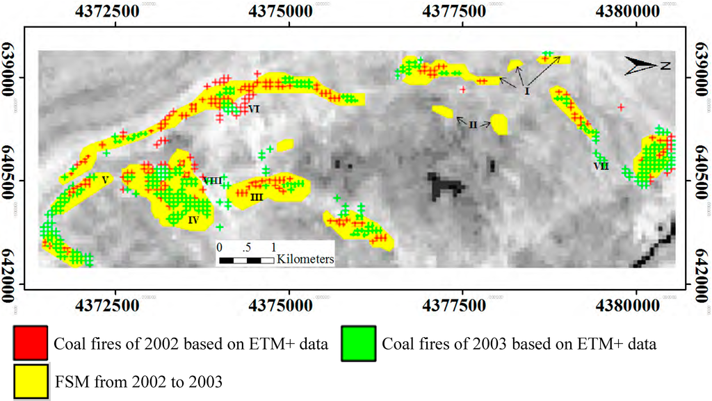 The results from validating the coal fire information of 2002 and 2003 indicated omission errors of 21.5 percent and 26.7 percent, respectively, and commission errors of 3.6 percent and 1.7 percent, respectively (see Table 3). The low commission errors indicated that the results that were obtained from the multi-temporal Landsat data are good for analyzing the coal fire spreading directions. The higher omission error may be explained as follows: based on Figure 9, we found that areas I, II, III, IV and V were the primary sources of omission errors, and the primary reason for coal fires in these areas going undetected may have been their depth. As is well-known, the deeper the coal fire is, the less heat is conducted to the surface. Consequently, temperature differences are less conspicuous, leading to more difficulty in discriminating coal files using the remote sensing technique. Another reason for the omission error may be that the spatial resolution of the Landsat data is lower, with a pixel size of 60 m × 60 m, whereas certain coal fires may be so small that they cannot be detected. Areas VI, VII and VIII are the primary sources of commission errors. The primary reason for mistaking these areas for coal fires may be the influence of solar radiation on the surface temperatures. Another reason may be the time lapse effects. The coal fires expanded at an average rate of 5 m per month. Certain points may have been true coal fires that appeared in the 2002 results but were burnt out before the CFM was finished, whereas other points may have appeared as coal fires in the 2003 results but began to burn after the coal fire survey was completed.