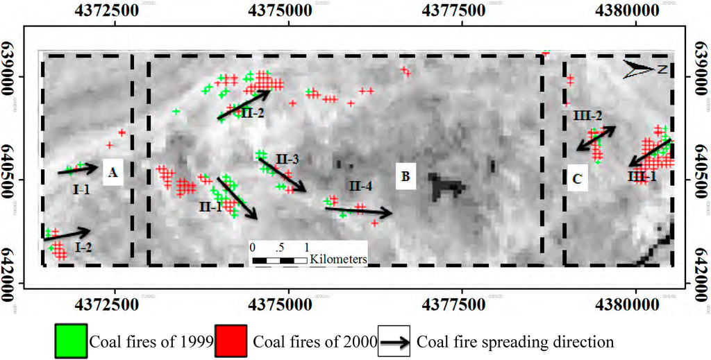 The coal fires that were extracted from the 1999 and 2000 Landsat data were overlaid to perform a comparative analysis, as shown in Figure 10. In Figure 10, it is clear that fire zones II-1, II-2, II-3 and II-4 are in the dotted-line-rectangle B. Most of the coal fires in this area spread north or northeast, whereas in the northernmost part of the WCF, region C, the coal fires in zone III-1 were inclined to spread southwest. In the southernmost part of the WCF, area A, some coal fires, such as I-1 and I-2, were inclined to spread southwest, except for certain points of fire scattered around them. There were additional coal fires that were inclined to spread laterally away from a zone of origin to some extent. The central line was regarded as an original coal fire belt that had a higher temperature than that of its two sides, which caused the coal fires to spread laterally away from the central line.