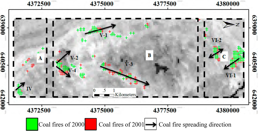 The coal fires that were extracted from the 2000 and 2001 Landsat data were overlaid to perform a comparative analysis, as is shown in Figure 11. In Figure 11, as was described above, we used a dotted-line-rectangle B to describe the middle region of the WCF. In region B, we found that coal fire zones V-1 and V-2 tended to spread northwest, whereas the coal fire zones V-3 and V-4 had a tendency to spread northeast. In the southern end of the WCF, coal fire zone IV in region A had a tendency to expand northwest. In the northern part of the WCF, the double arrow of coal fire zone VI-2 in region A was spreading southeast, whereas coal fire zone VI-1 was expanding laterally away from a central line.