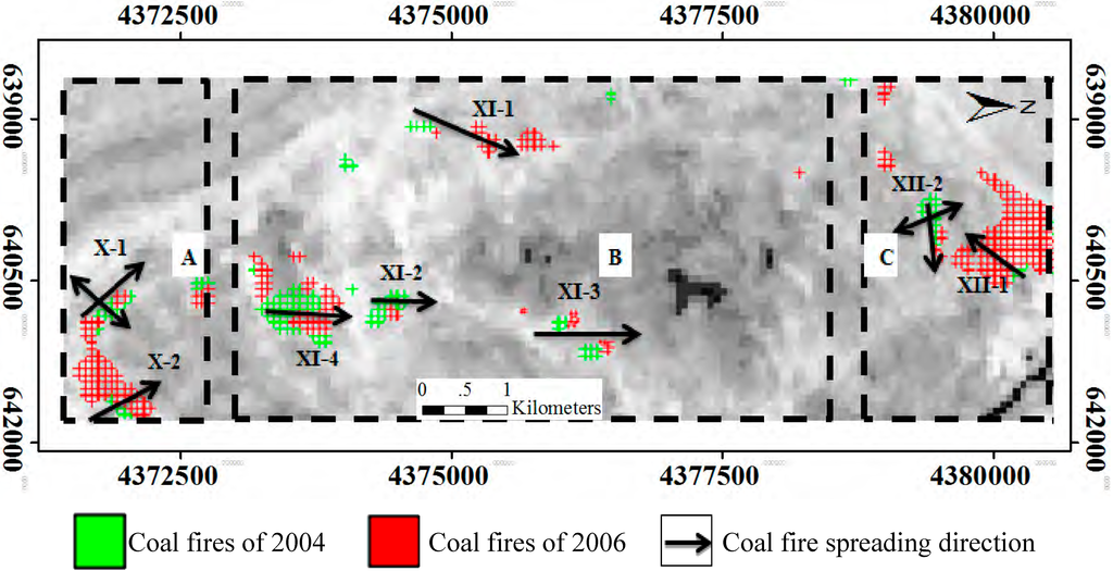 The coal fires that were extracted from the 2004 and 2006 Landsat data were overlaid to perform a comparative analysis, as is shown in Figure 13. In this figure, coal fire zone XI-1 in area B was spreading approximately northeast, whereas the coal fire zones XI-2, XI-3 and XI-4 were believed to have a tendency to spread north. In the northern end of the study area, coal fire zone XII-1 was spreading south or southwest, and the double arrow of coal fire zone XII-2 shows the spreading direction of coal fires toward to both sides from the middle. When this coal fire burnt out after 2004, the fire was then believed to tend to spread east. In the southern end of the WCF, coal fire zone X-1 was predicted to spread outward in opposite directions: southwest and northeast. When this coal fire burnt out after 2004, the fire began to spread northwest. Within this same area, coal fire zone X-2 was also believed to expand northwest.