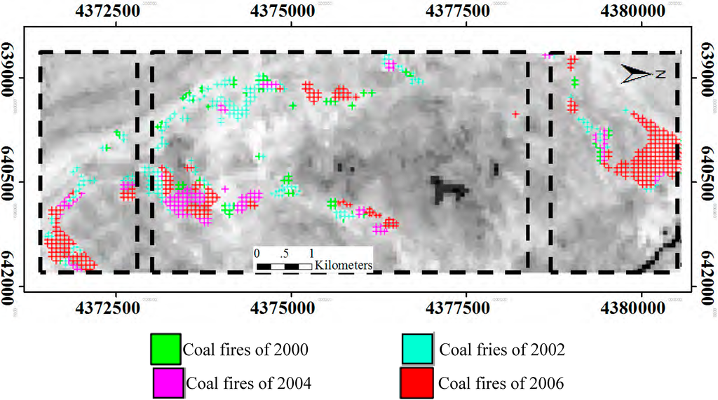 Cross-validation of coal fire information that was extracted from 2001 Landsat and ASTER imageries, the two-year’s worth of coal fires were stacked for overlay analysis.