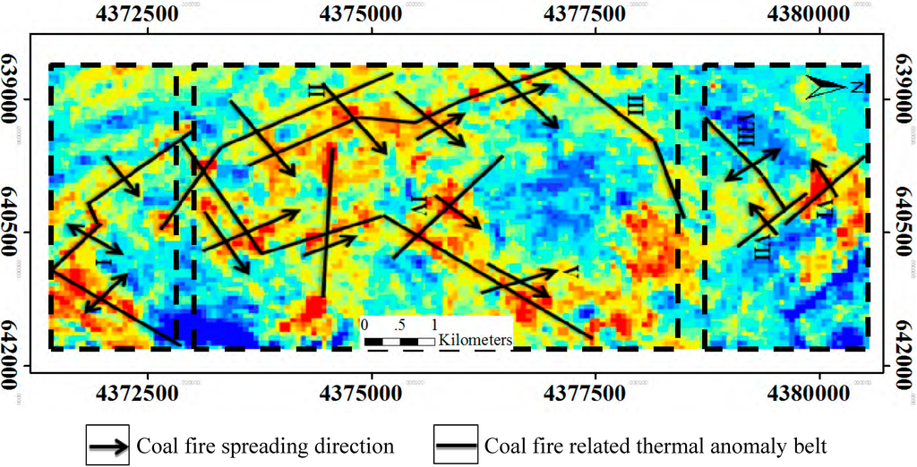 The detection of the propagation of coal fire is helpful for predicting their development trends and may provide useful information for controlling and extinguishing coal fires. Knowing the coal fire’s spreading direction is valuable for predicting the potential expansion of the hazard that is caused by coal fires and provides local firefighters with critical information. Previous literature discussing the coal fire spreading direction has been based mostly on various physical methods, such as temperature measurement monitoring in boreholes and radon and aeromagnetic measurements [,,,,,].