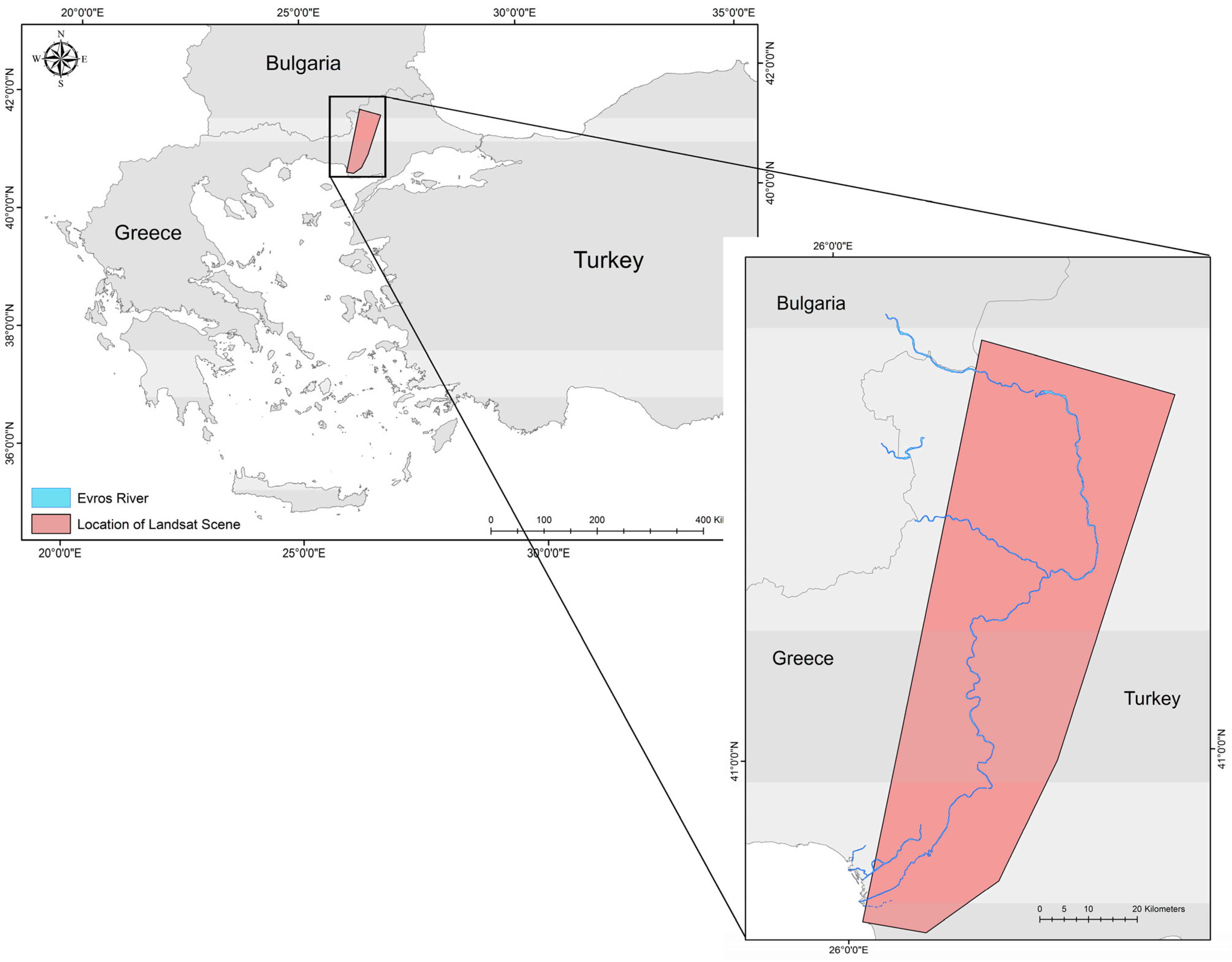 However, to our knowledge, little attention has been paid so far in exploring the use of the regularised kernel Fisher’s discriminant analysis (rkFDA) in flooded area mapping from optical imagery. This technique inherits the benefits from both the standard regularised discriminant analysis and from the non-linear FDA, by exploiting the flexibility of kernel methods jointly with model regularisation. These features make the rkFDA a notable classifier that has already provided performances close or superior to that of the SVMs [50]. In addition, rkFDA have been successfully employed for multi-temporal flooded area mapping in an area of homogeneous land cover (James River, South Dakota—[32]). Nevertheless, analysis of the rkFDA classification technique for flooded area mapping is limited, and has only been previously applied to an agricultural region in USA. To our knowledge, evaluating the accuracy of this technique over a fragmented and heterogeneous European region, in particular in the semi-arid climate of the Mediterranean, has not previously been examined. Notably, it would thus be interesting to assess if the accuracy of this technique is transferable to other global regions. Given the already promising performance of SVMs in applications related to natural hazards, it would be undoubtedly very interesting to compare the rkFDA technique against SVMs in terms of detecting and mapping flooded areas from optical imagery such as that from Landsat sensors. Particularly, the use of freely distributed EO datasets from Landsat TM sensor which has already shown to be particularly successful in mapping inundation areas [10,15,51,52,53,54]. In this context, this study aims to compare the performances of the SVMs and rkFDA methods in extracting flood areas in a fragmented and highly heterogeneous Mediterranean environment. As a case study, the Evros/Maritsa River floodplain located on the border of Greece and Turkey is used.