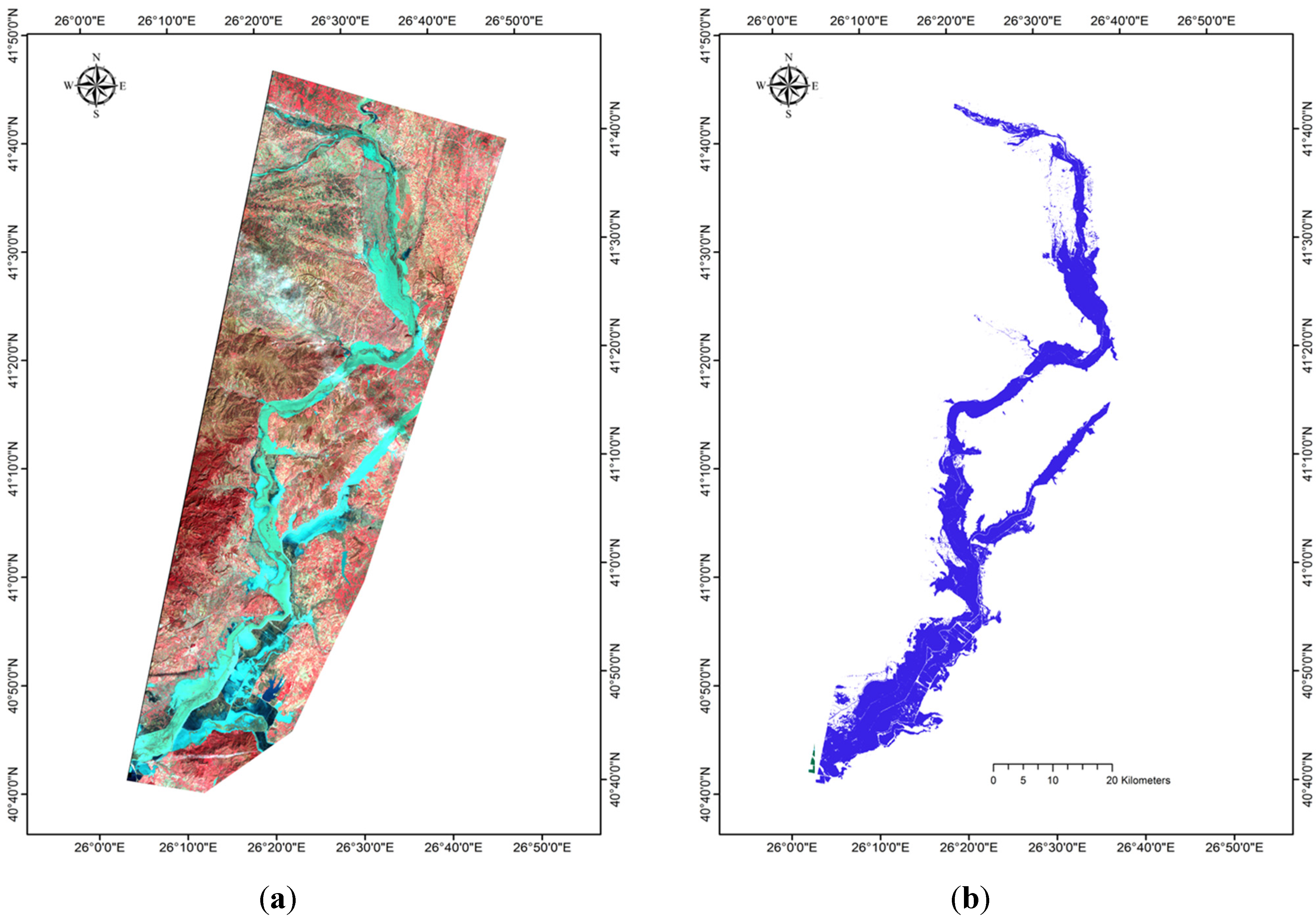 (a) False colour composite (RGB = 4-3-2) of the post flood Landsat TM imagery acquired on February 19, 2010, flooded area in cyan; (b) Flooded area reference estimate obtained from the Greek Payment Agency (OPEKEPE).