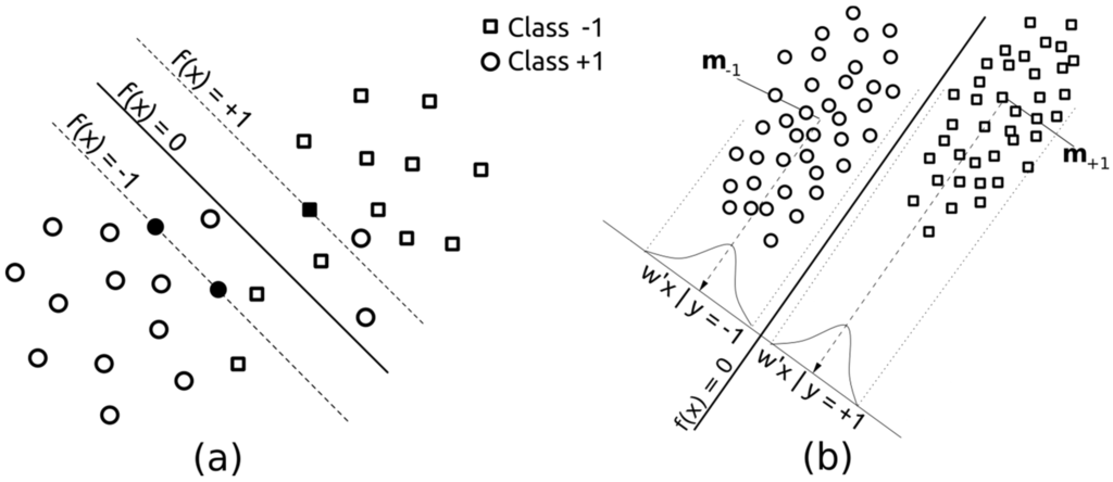 Graphical representation of the employed methods, (a) Support Vector Machines (SVMs) and; (b) Fisher’s Discriminant Analysis (FDA). For SVMs, black examples denote unbounded support vectors.