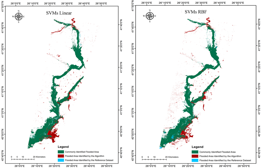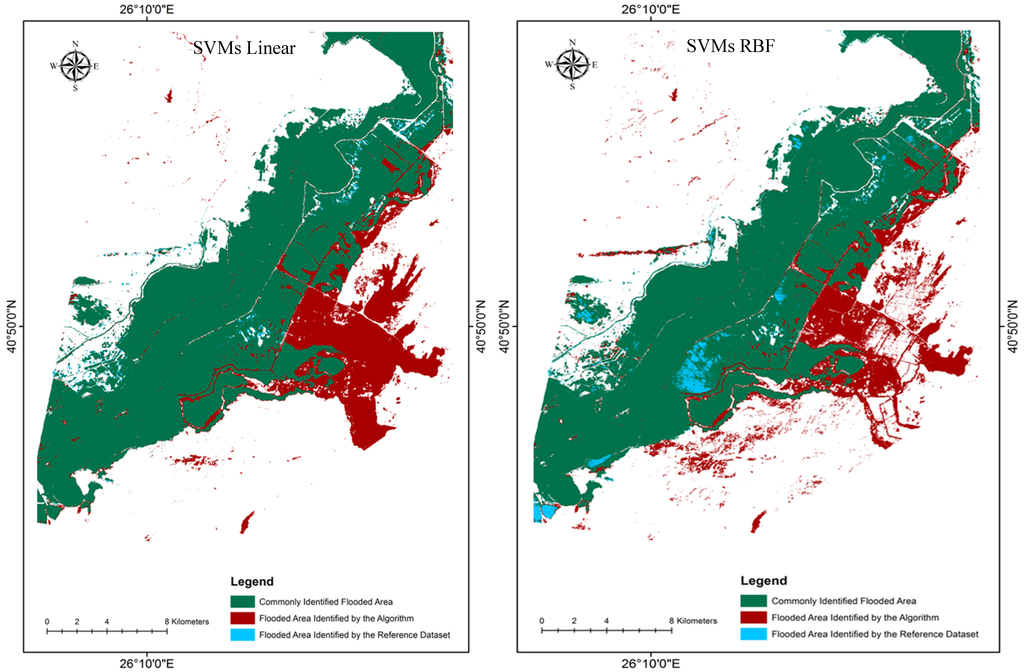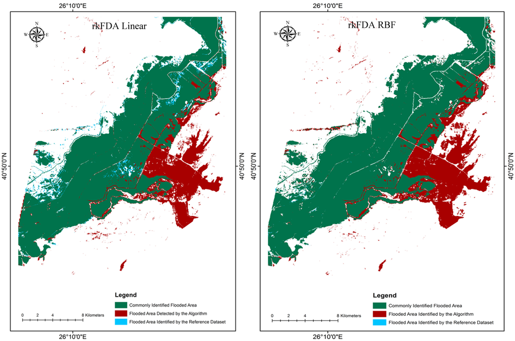 Apart from the evaluation on the basis of the error matrix statistics (UA, PA—Table 1), the classified flooded areas were assessed against the reference flooded area estimate. Absolute differences in flooded area estimates between the reference and the SVMs classifications methods varied from 1.2%–2.7% and between the reference and the rkFDA classifications from 1%–3.6%, respectively, indicating a close agreement between the reference polygon and each classification output. Notably, highest agreement in the total flooded area estimates was observed in the case of the rkFDA RBF implementation, followed by the SVMs Linear, SVMs RBF and rkFDA linear classifications, respectively.
