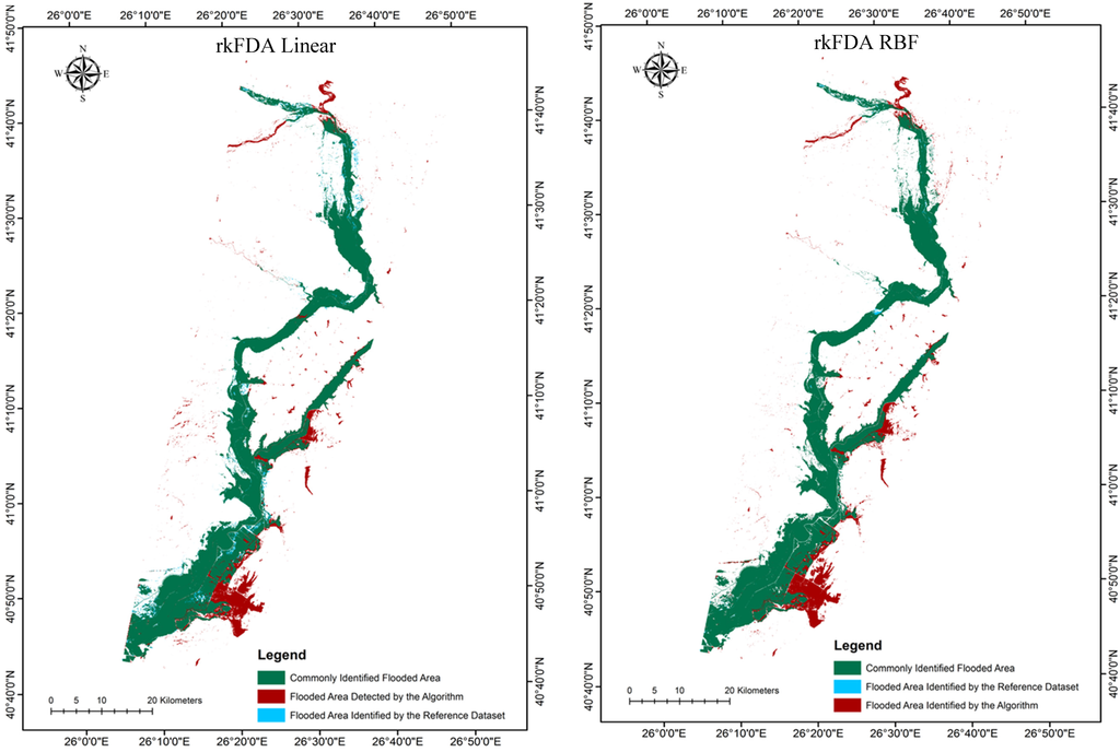 As illustrated in Table 2, highest DFA was also observed for the case of the rkFDA RBF classifier implementation, with a common flooded area of 674.74 km2. Evidently, in terms of skipped flooded area (SFA), results were proportional to the common flooded area estimates; similarly, the best result i.e., the lowest rate of skipped area (0.032%) was obtained in the case of the rkFDA RBF scenario (6.49 km2), also evidenced in the omission error percentage (0.010%). Comparably low SFA and omission errors were also evident for the SVMs linear classification (SFA = 8.37 km2, Omission Error = 0.012%), whereas the highest rate was attributed to the rkFDA linear scenario with 24.78 km2 (omission error = 0.036%) of skipped flooded area. Evaluation of the subset of the study area illustrated in Figure 5 also clearly depicts an increase in flooded area identified by the reference polygon but not the algorithm for both the SVMs linear and rkFDA RBF classifications in comparison to the other two. Yet, in terms of falsely detected flooded area (FFA, commission error), no clear trends in observations were evident, apart from the fact that the rkFDA linear classification algorithm reported the lowest FFA of all scenarios. This is again clearly evidenced in the south eastern region of the study area subset in Figure 5.