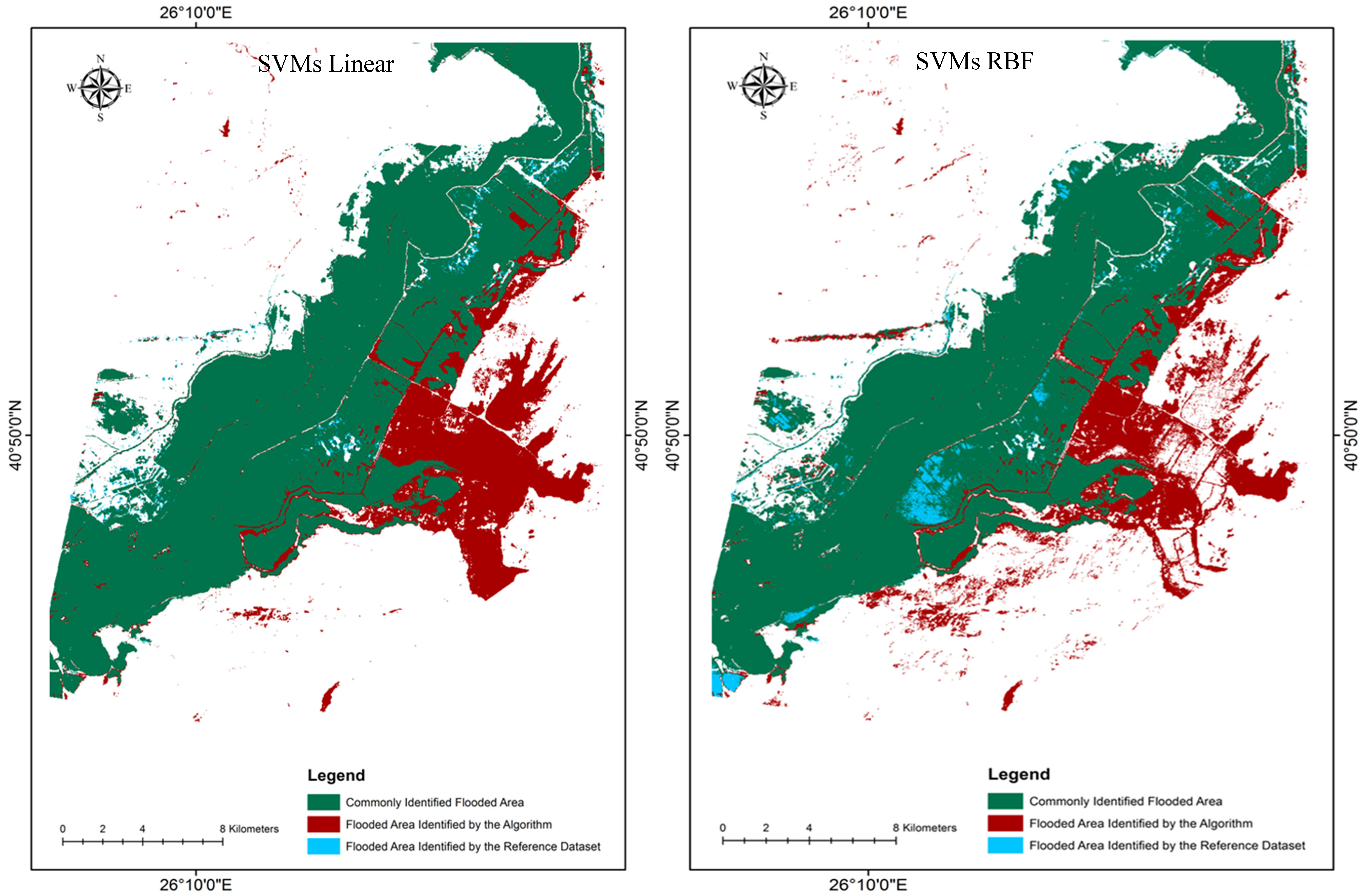 A visual comparison of the derived flooded area maps from the different methods investigated (Figure 4 and Figure 5) shows that there are a number of outlying pixels identified as flooded areas visible in all estimations that are not actually present on the validation map. The majority of these outlying pixels are located to the south east of the flooded area and are most prominent in the SVMs non-linear estimation.