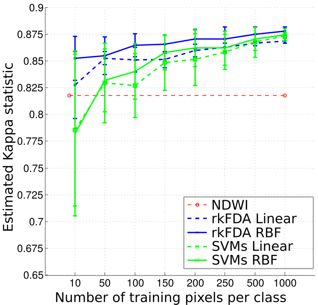 The overall accuracy values may seem very close, but are biased by the very large number and unbalanced number of samples per class. These differences in accuracy become more striking when looking at Figure 6, illustrating the evolution of the K coefficient as the size of the training set grows. As a first observation, as the number of samples employed to train the classifiers increases, the accuracy grows. However, when employing 150 or more samples per class, the Kappa coefficient shows a stable accuracy, and only the standard deviation of the outcomes decreases. Furthermore, for small sample sizes, the SVMs show a generally lower accuracy and higher standard deviations. On the contrary, the rkFDA, and in particular the non-linear variant, shows a very stable behaviour, also providing high accuracy for the tested situation, compared to the situation exploiting more than double the training samples. In this setting, being unsupervised, the NDWI shows a constant accuracy.