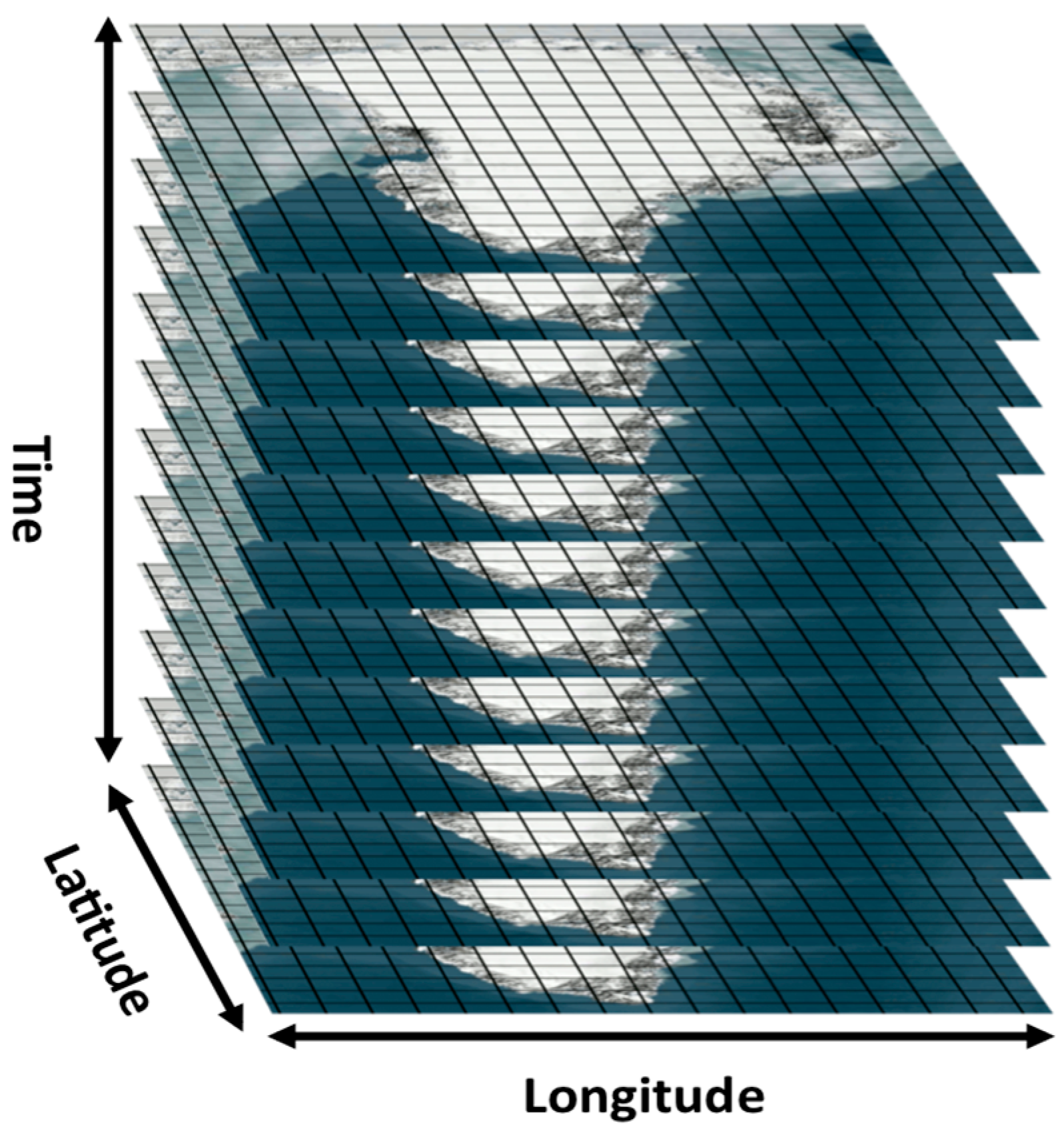 Stacked grids of imagery that form the basis of the three-dimensional Data Rods database structure. Within the database, pixels are stored in temporal order (vertically) at each grid cell rather than spatially (horizontal). A vertical column of pixels at a single grid cell makes up one data rod.