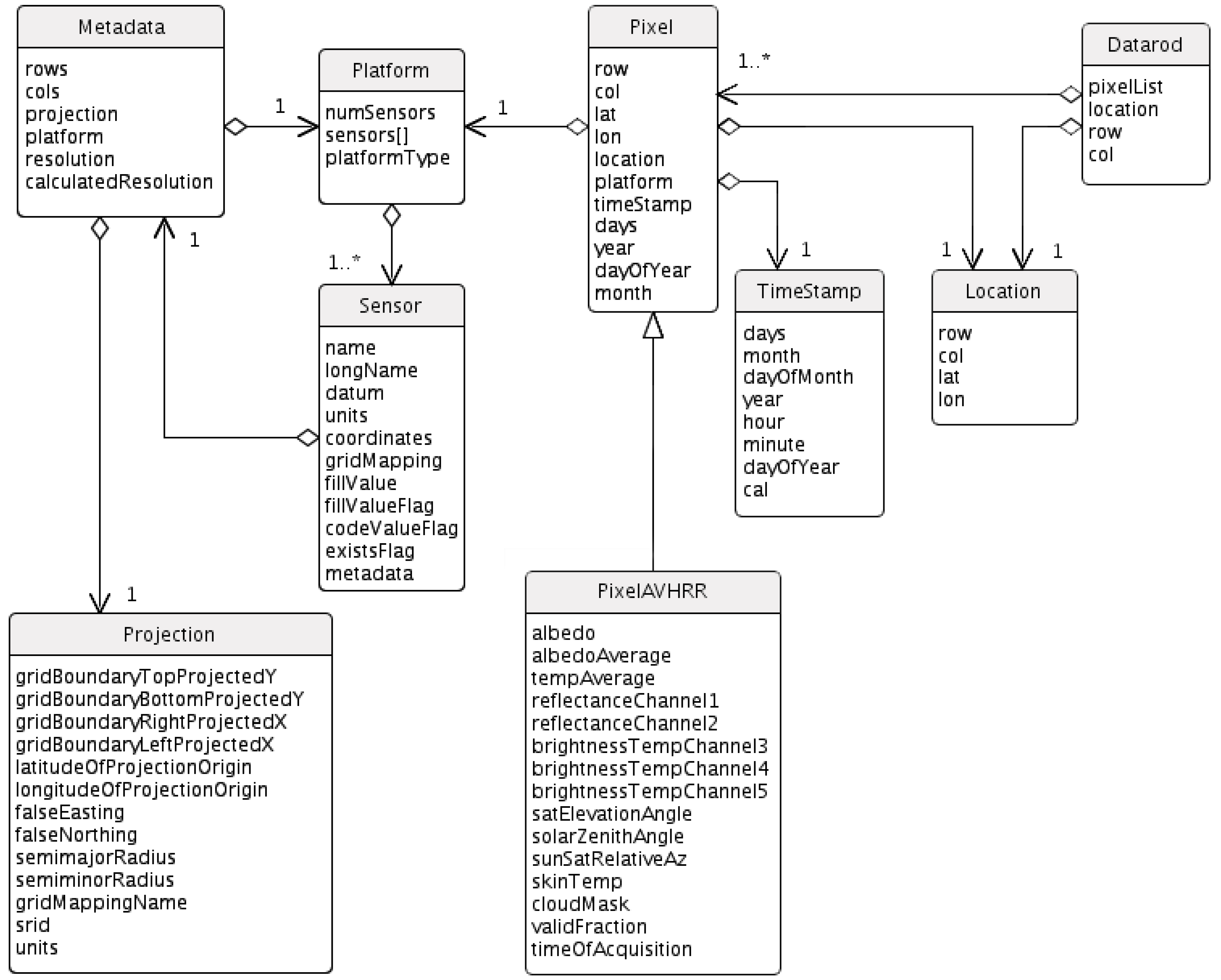 The source dataset of Greenland satellite imagery was retrieved across the Internet in the traditional “search, order, and download” manner, via FTP as either binary (flat) images for single dates and times, or as NetCDF files. A collection of Java programs and shell scripts was used to reformat the data and insert the pixels into the pure-object databases. Initial attempts to store the entire dataset in a single database were successful; however, for parallel processing and administrative tasks, we found it more efficient to break it into multiple databases, each covering a 5-year time span and containing no more than approximately 500 million pixel objects. To accelerate retrieval rates for time-series analyses, pixels were ingested into the databases in chronological order at each gridded location. This arrangement can be viewed as a vertical stack of pixels through time (the Z axis), with latitude and longitude as the X and Y axes, as shown in Figure 1. The chronological structure also facilitated the creation of the data rod objects described in the next paragraph. B-tree indexing further accelerated retrieval times for the most commonly used member data within the pixel objects. In addition, each pixel contained a reference to its source satellite, sensor, time of data collection, and geographical location, all of which were stored as objects in the databases. Figure 2 shows the object schema as a Unified Modeling Language (UML) diagram. Any of the member data contained in any object could be used as a search term. For instance, a researcher could ask to find “all the pixels in the month of June west of 45 degrees longitude where the surface temperature was greater than 0 °C” and receive a collection of pixels that matched that criteria.