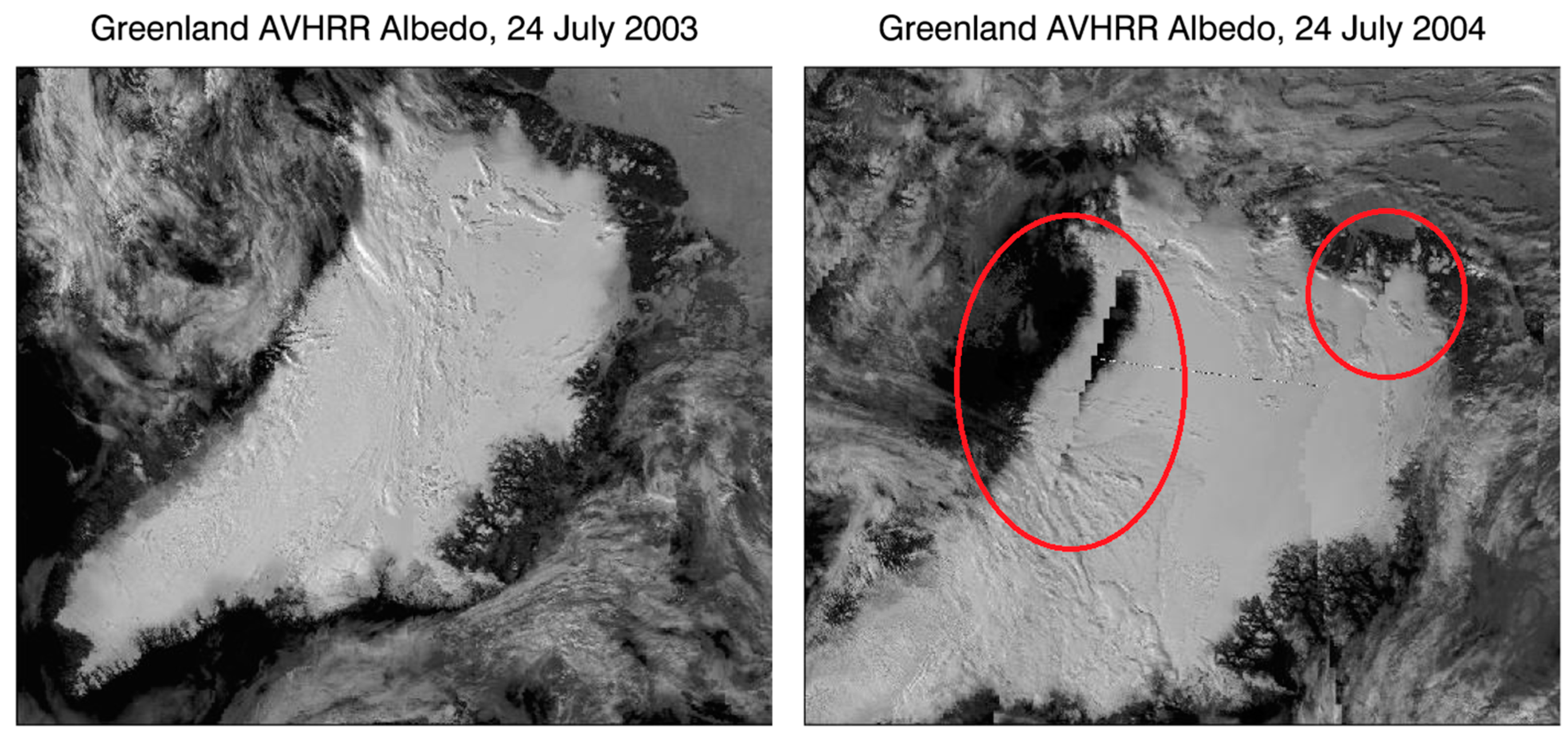 An example of significant geocoding errors. The left panel is a typical albedo image of Greenland during 2003, correctly composited and geocoded. The second panel (right) shows severe geocoding errors during mid-summer 2004, most apparent in the circled areas. Note sections of the bad image are repeated and offset, and the entire island has shifted downward in the frame. Both images were obtained from the same Advanced Very High Resolution Radiometer (AVHRR) dataset using similar geographical bounding boxes and projections, and should appear identical except for natural variations in clouds and ice.