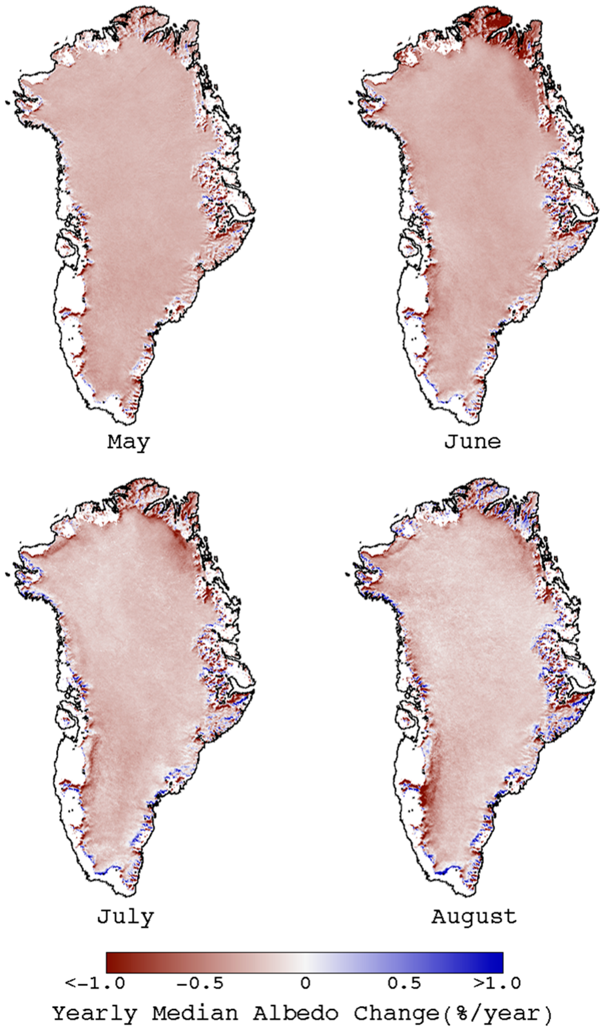 To gain a better understanding of changes in the GrIS albedo over time, the data rods were then used to evaluate the albedo trends at each grid cell. Each data rod was again filtered by month, filtered to eliminate cloudy days, and asked returned a linear regression of its albedo for the 25-year period. The results were combined to construct monthly images, shown in Figure 5. This analysis showed a nearly uniform downward albedo trend across the entire island: an unrealistic result that warranted further investigation (see Section 5).