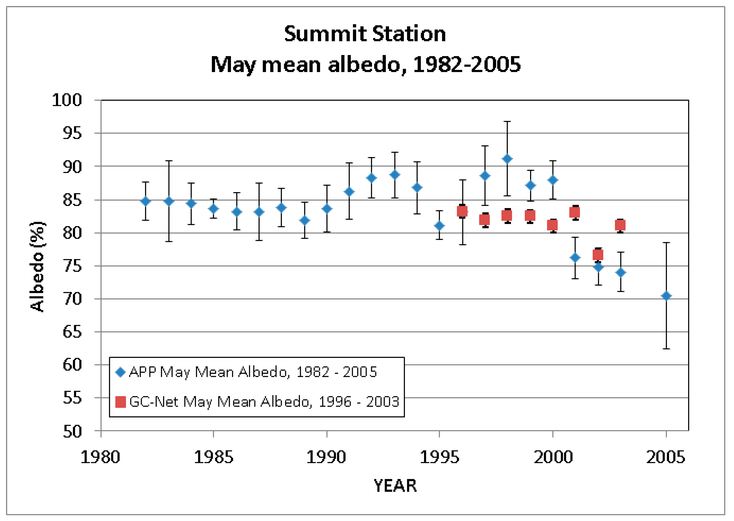 Mean cloud-free May albedo values from the AVHRR Polar Pathfinder (APP) satellite dataset and Greenland Climate Network (GC-Net), for Summit Station, Greenland. The error bars show one standard deviation. The APP albedos are based on pixels with a 25 km2 ground field of view; the GC-Net albedos were collected in situ. Missing years are due to insufficient data. Of special note is the sudden drop in APP mean albedos starting in 2001.