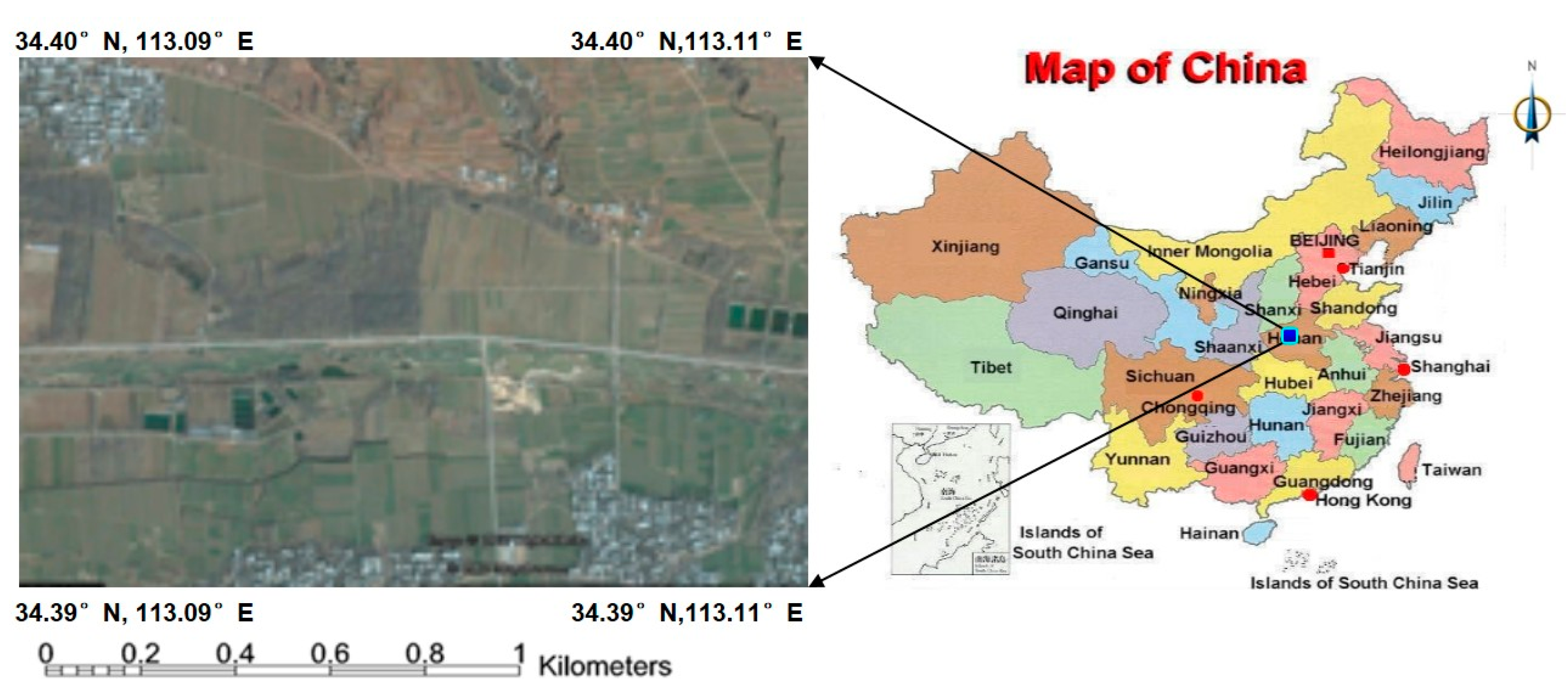 The study area was located in Hanjietou (34.39°N to 34.40°N and 113.09°E to 113.11°E, see Figure 1), Henan province, in the middle of China, covering a south-eastern part of the city of Dengfeng of about 2.1 km2, The elevation value (i.e., the heights above the geoid) range from 220 m to 310 m. It should be noted that there were hills located in the east and north of the study area, which could hinder the woodland extraction due to topographic effects. The study area mainly comprised woodland, farmland, buildings, and bare land. The main tree species in the study were pine and northern larch, categorized as woodland (low-density needleleaf forest), which facilitated a binary forest/non-forest classification.