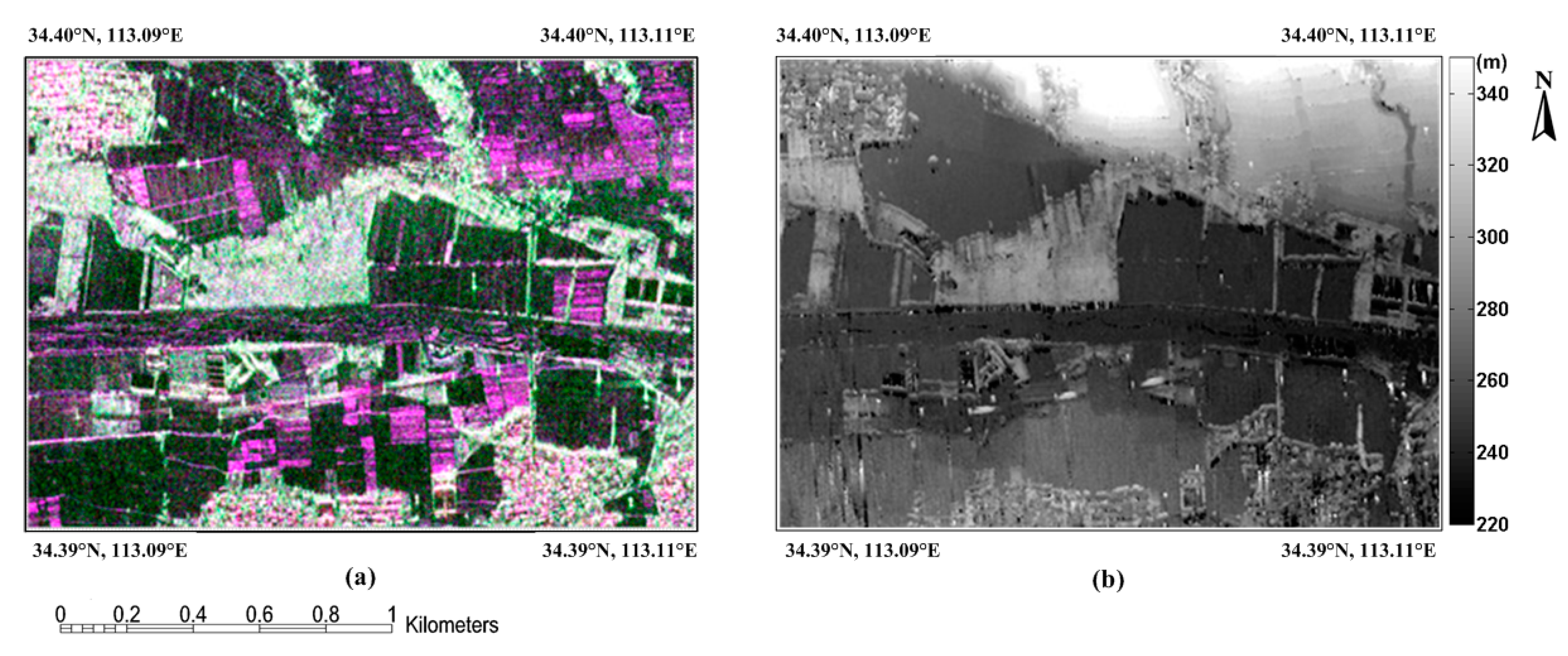 In the pre-processing stage, polarimetric and geometric calibration was first implemented with the aid of trihedral and dihedral corner reflectors deployed in the study area. For the polarimetric SAR pre-processing, a Lee polarimetric filter was employed with the P-band PolSAR image so as to reduce the impact of speckling [33], with the size of filter window being 5 × 5 pixel. For the interferometric pre-processing, the InSAR processing chain was undertaken to generate the height map with the X-band InSAR images. The InSAR processing consists of the following main processing steps: (1) accurate co-registration of the focused SAR data; (2) calculation of the interferogram associated with multi-look processing of four looks; (3) interferogram flattening; (4) interferogram filtering with a 5 × 5 pixel window; (5) phase unwrapping; and (6) unwrapped phase to height conversion. The P- and X-band datasets were then georeferenced to the same reference system (WGS84 ellipsoid and Transverse Mercator (TM) projection) with a grid size of 1 m. Finally, an orthorectified PolSAR image and an InSAR elevation map (see Figure 2) were generated for the following fusion.