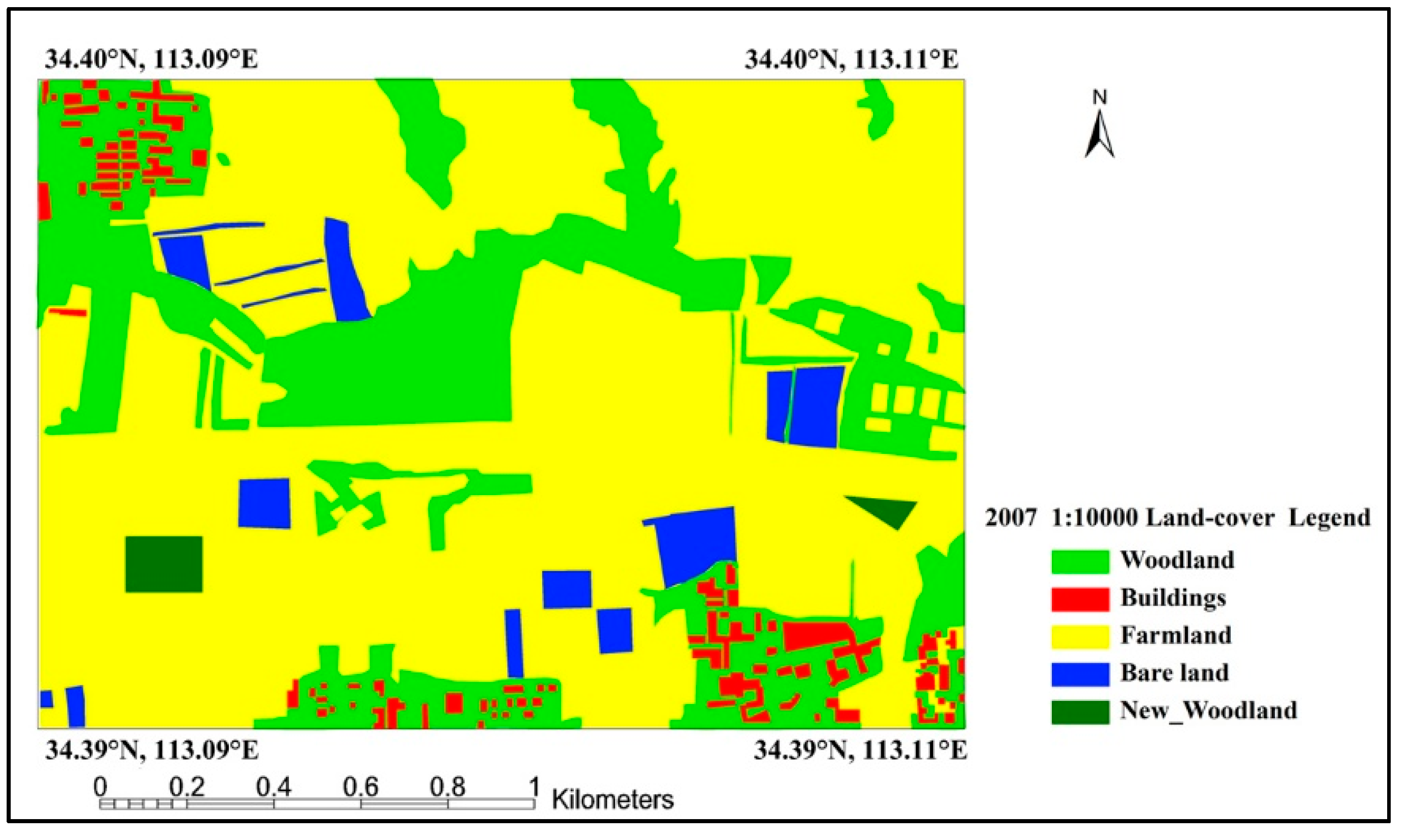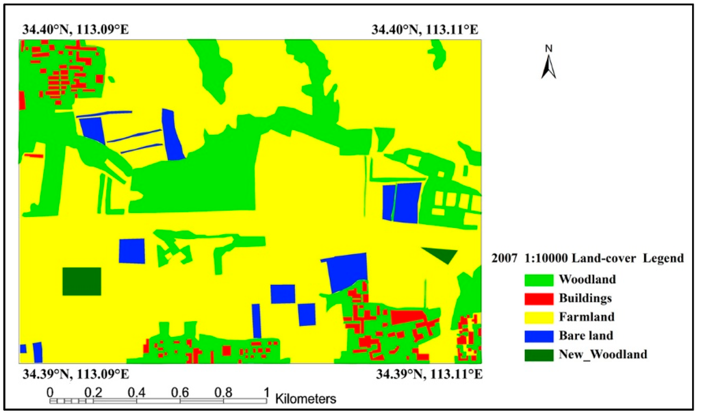 The reference land-cover selected for the study was a 1:10,000 land-cover product produced by the local surveying department of Henan in 2007. This 1:10,000 land-cover product was manually produced by a photointerpreter via a field investigation of the different land-cover types. The accuracy of the land-cover product was not less than 90%. The land-cover was translated to the reference system (WGS84 ellipsoid and TM projection) with grid size of 1 m, in agreement with the georeferenced X- and P-band SAR images, using a small number of ground control points. However, the land cover was subjected to some errors in classification, and classes may have changed between 2007 and SAR images acquisition. Landsat TM images taken from 2007 to 2011 were used for the woodland change detection. It was found that the majority of the woodland had not changed between 2007 and 2011, except for a small area of newly planted woodland, as shown in Figure 3. Therefore, the reference land cover could be considered as a reliable data source for the accuracy validation.