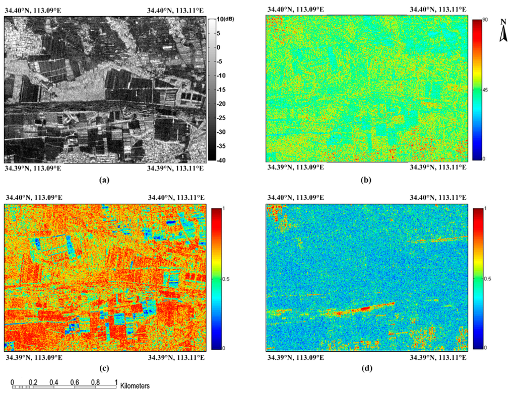 (a) Span, (b) alpha angle, (c) entropy, and (d) anisotropy of the study area.