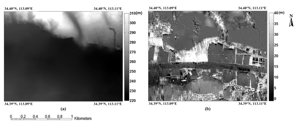 The DEM and nDSM of the study area. (a) DEM. (b) nDSM.