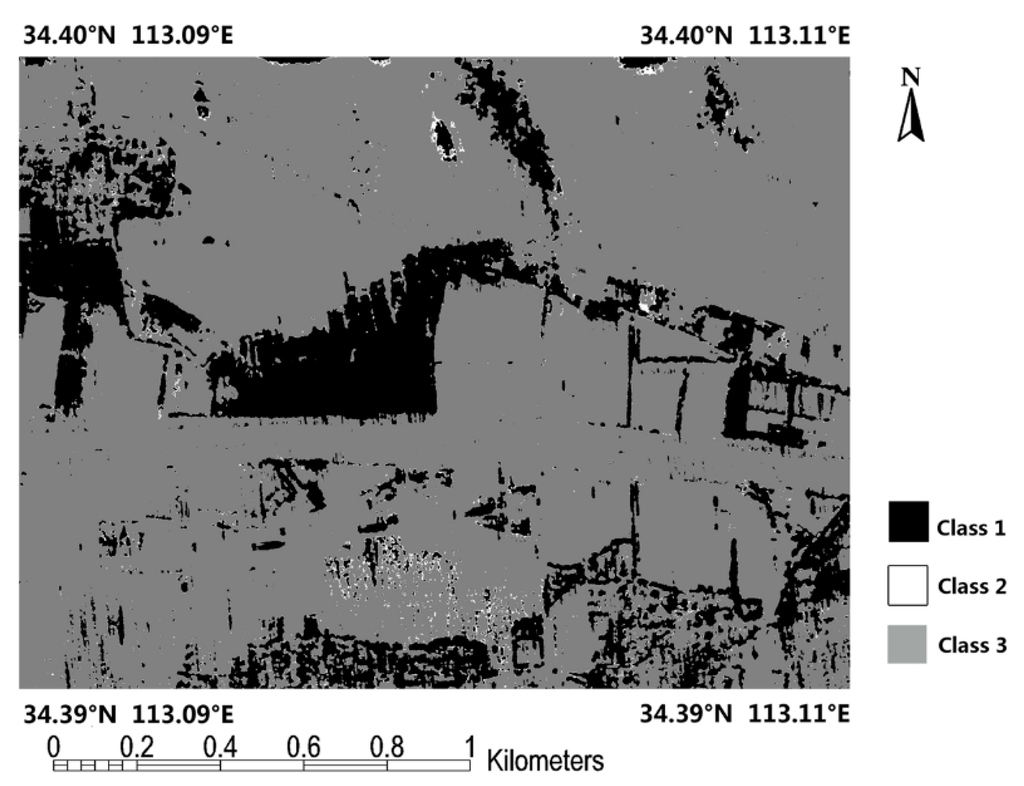 Clearly, the smaller the value of is, the more similar the pixels are, while the greater the value of is, the greater the differences the two groups have. Therefore, the value of should be as large as possible. Thus, one can change the threshold value of so that reaches its maximum value. Threshold segmentation was implemented using the optimal threshold obtained by step (2), and the nDSM image is divided into three areas. Figure 8 shows the threshold segmentation result of the X-band interferometric elevation map. The InSAR elevation map classification result can be obtained by assigning the segmentations to land-cover classes, with respect to the PolSAR image classification result.