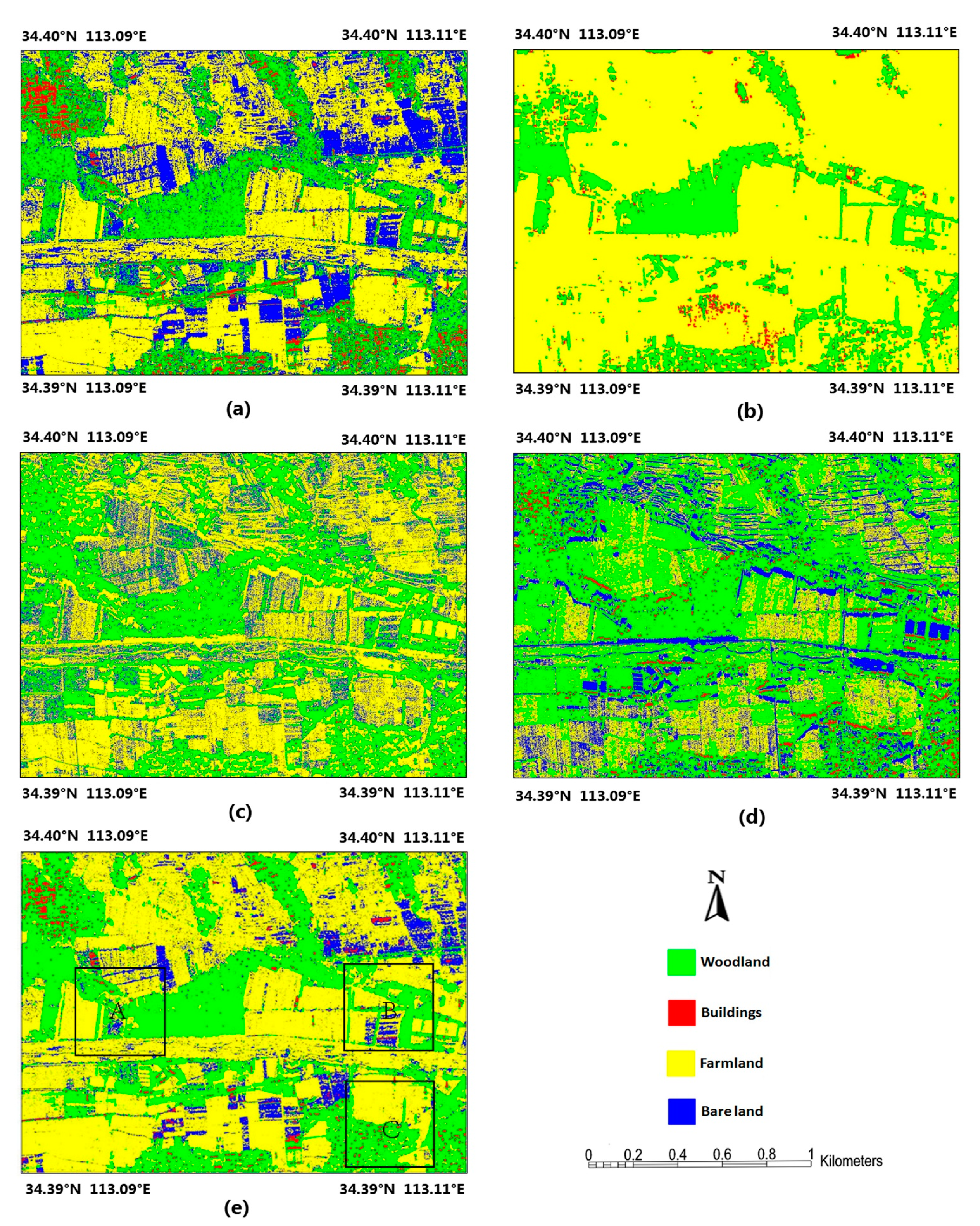From the point of view of visualization and quantitative evaluation, the D-S fusion result with the PolSAR and InSAR images obtained the highest classification accuracy, and all the classes were classified correctly. For the woodland extraction application, the highest accuracy was again obtained by the D-S fusion result. To make a thorough analysis for the woodland extraction accuracy, we extracted three partial regions (see Figure 9e, A, B and C), respectively, from the same areas of the classification results, and the fusion results are shown in Figure 11a–c. The woodland extraction accuracies of the three regions are shown in Table 11. As can be seen from the P-band classification result of region A in Figure 11 and Table 11, there are many isolated pixels due to the effect of SAR speckling, and some of the pixels of the woodland class have been mistakenly classified as buildings or bare land. On the other hand, the edge of the woodland area is continuous and the texture of the woodland area is also uniform in the X-band classification result, so that the best woodland extraction accuracy can be achieved. The K-means and D-S fusion results also achieve improved woodland extraction accuracy as they incorporate the advantages of the X-band classification in region A. The Z-test shows that the fusion and X-band results of the woodland extraction in region A are consistent with the land-cover product since the Z values of the three results are all less than the critical value of 1.96. However, for the P-band woodland extraction result, a contrary conclusion can be drawn. In region B, the P-band classification result can distinguish woodland, except for some isolated pixels, as in region A. However, the X-band classification result has a lower UA accuracy than the P-band result as part of the pixels belonging to the farmland class have been mistakenly classified as woodland. The reason for this can be explained by the fact that the X-band InSAR segmentation error leads to the X-band classification error in the region. The two fusion results partly make up for the deficiency of the individual P- and X-band classification results, and achieve the best woodland extraction accuracy. Therefore, as with the result of the Z-test in region B, the two fusion results of woodland extraction are considered to be consistent with the land-cover product. In region C, most of the woodland can be correctly distinguished in the P-band classification result, and some of the pixels belonging to the buildings class are mistakenly classified as woodland. In the X-band classification result, almost all of the pixels belonging to the buildings class are mistakenly classified as woodland, which directly results in the lowest UA accuracy of all the methods.