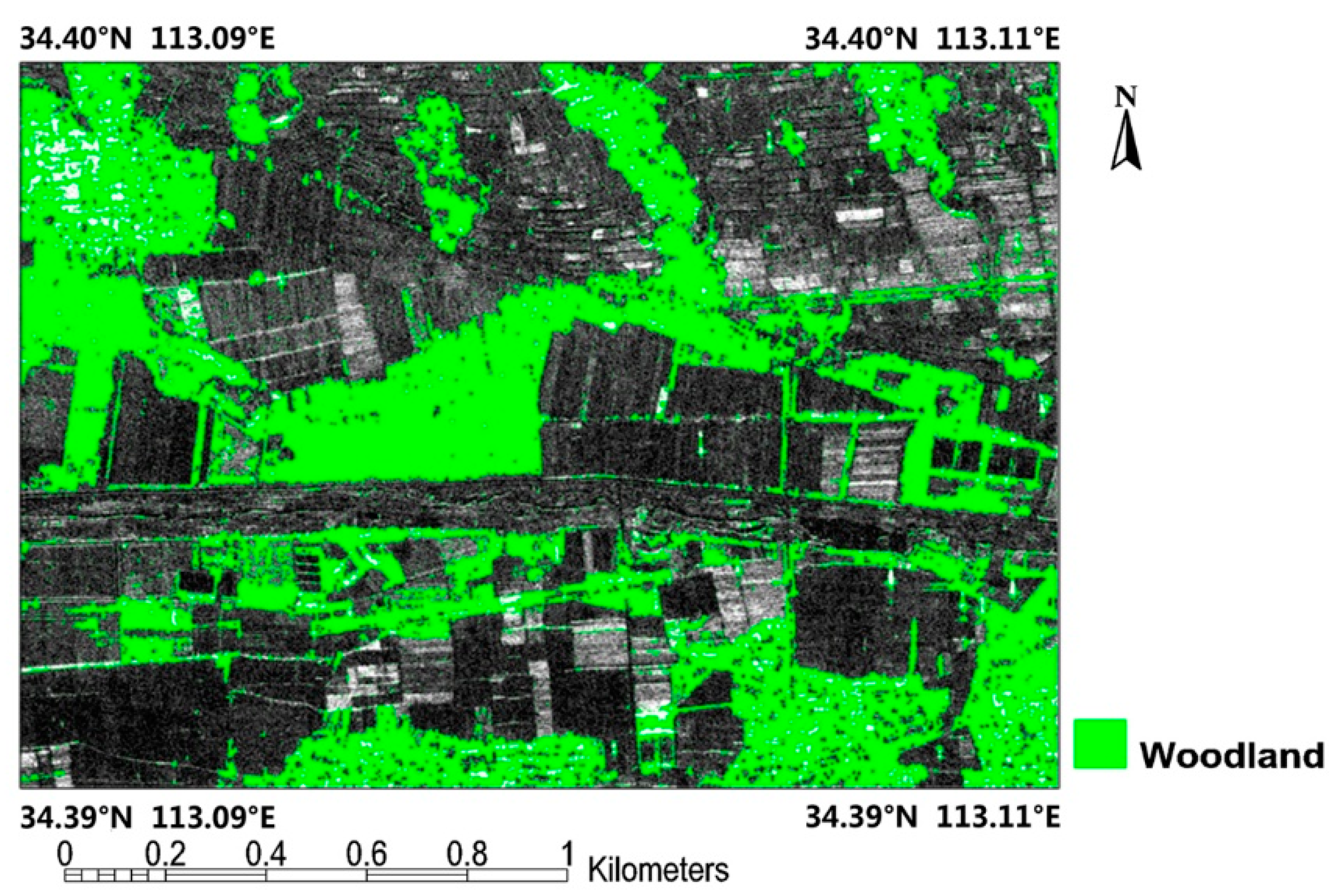 Woodland is defined in Chinese woodland management regulations as low-density forest with an understory of shrubs and herbaceous plants. Differing from forest with higher densities and areas of trees, woodland generally refers to low-density arbor and shrub forest with a smaller canopy closure [1]. Mapping and monitoring of woodland resources have been the subject of significant attention, as it offers an effective means for the measurement of carbon storage, which is highly relevant to climate change [2]. SAR as an active sensor offers all-weather, day/night coverage imaging capability, and it can also yield information on the underlying structure of land cover, particularly, woodland and grassland. Many studies have been conducted using SAR techniques, e.g., woodland classification, extraction and mapping [3,4,5,6,7,8]. Currently, an increasing number of spaceborne and airborne SAR systems are being launched, which can provide abundant multi-frequency (X, C, S, L, P), quad-polarization, multi-interferometric mode data for woodland resource research.