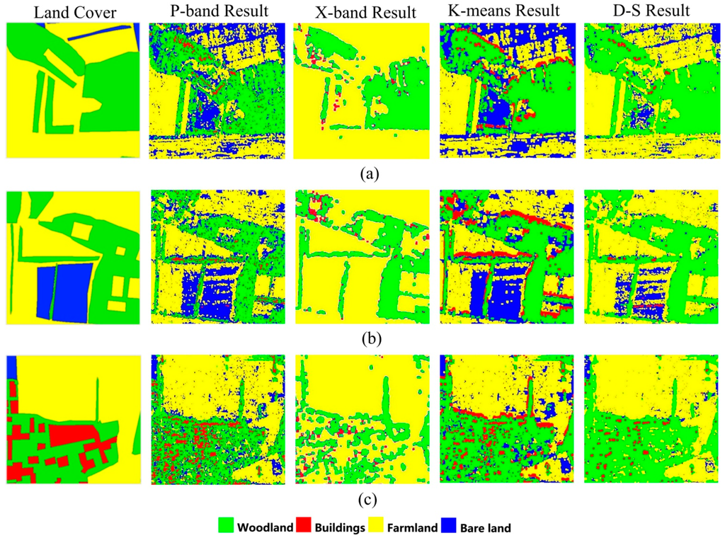 Overall, the D-S fusion can take full advantage of the P- and X-band classifications and can improve the classification accuracy of the final result. In addition, the consistency of the D-S fusion and the K-means fusion results validates the correctness of the D-S fusion result.