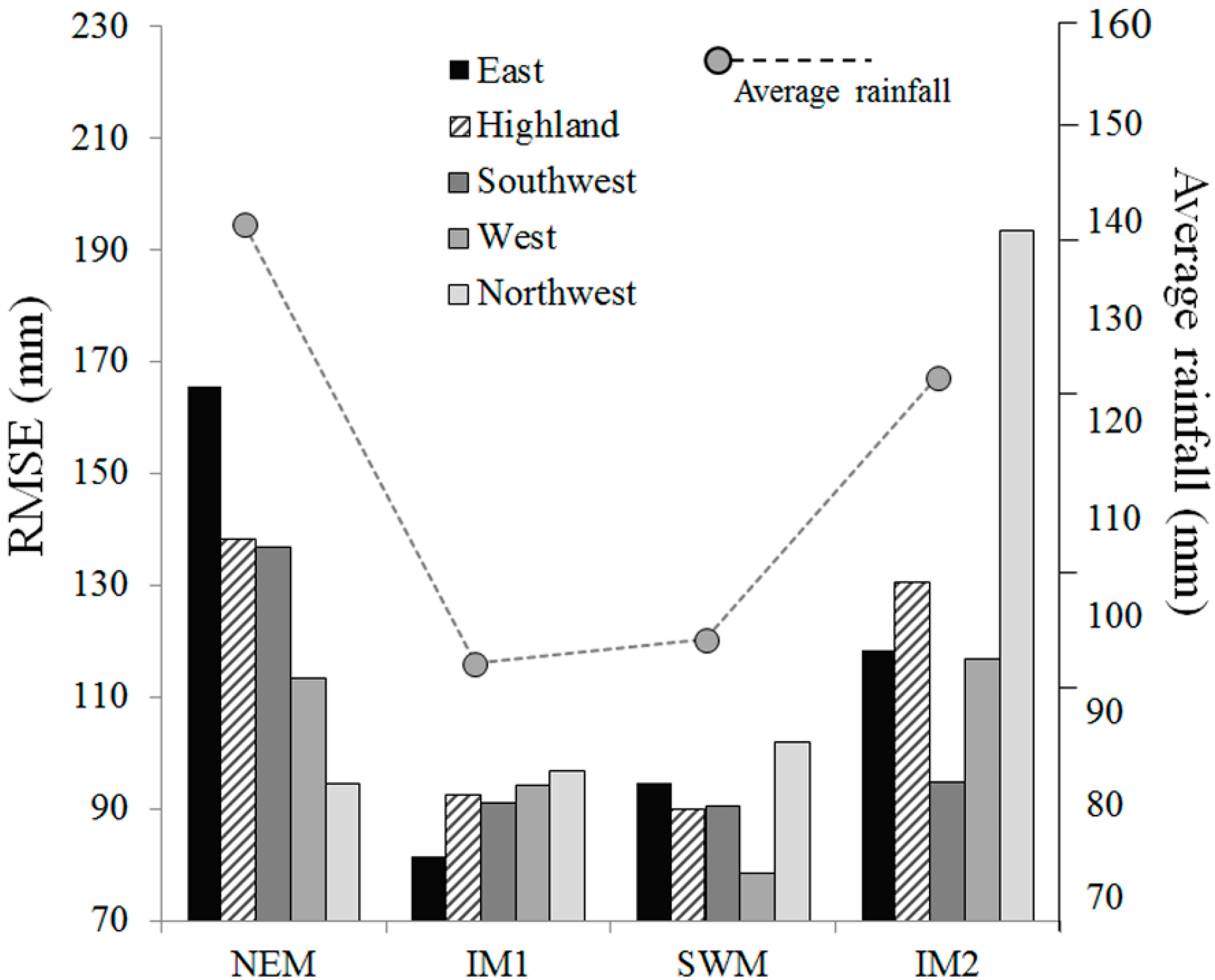 31]. The major constituent was the effect of scaling up the instantaneous rain rate from an hourly to a monthly basis using the given scale factor. Other contributing factors were the temporal differences between TRMM and rain gauge measurements and the systematic error of interpolation. However, the effect of temporal differences was considered minimal, because the time mismatch was only 1h (~8.00–9.00am local time). From another perspective, the interpolation showed a linear effect towards increasing rainfall in a relatively small proportion. The RMSE in this study was relatively lower than in previous studies conducted in Southeast Asia using a similar data product. We clarified that the RMSE varied depending on seasonal rainfall intensity and method to calculate the cumulative monthly rainfall.