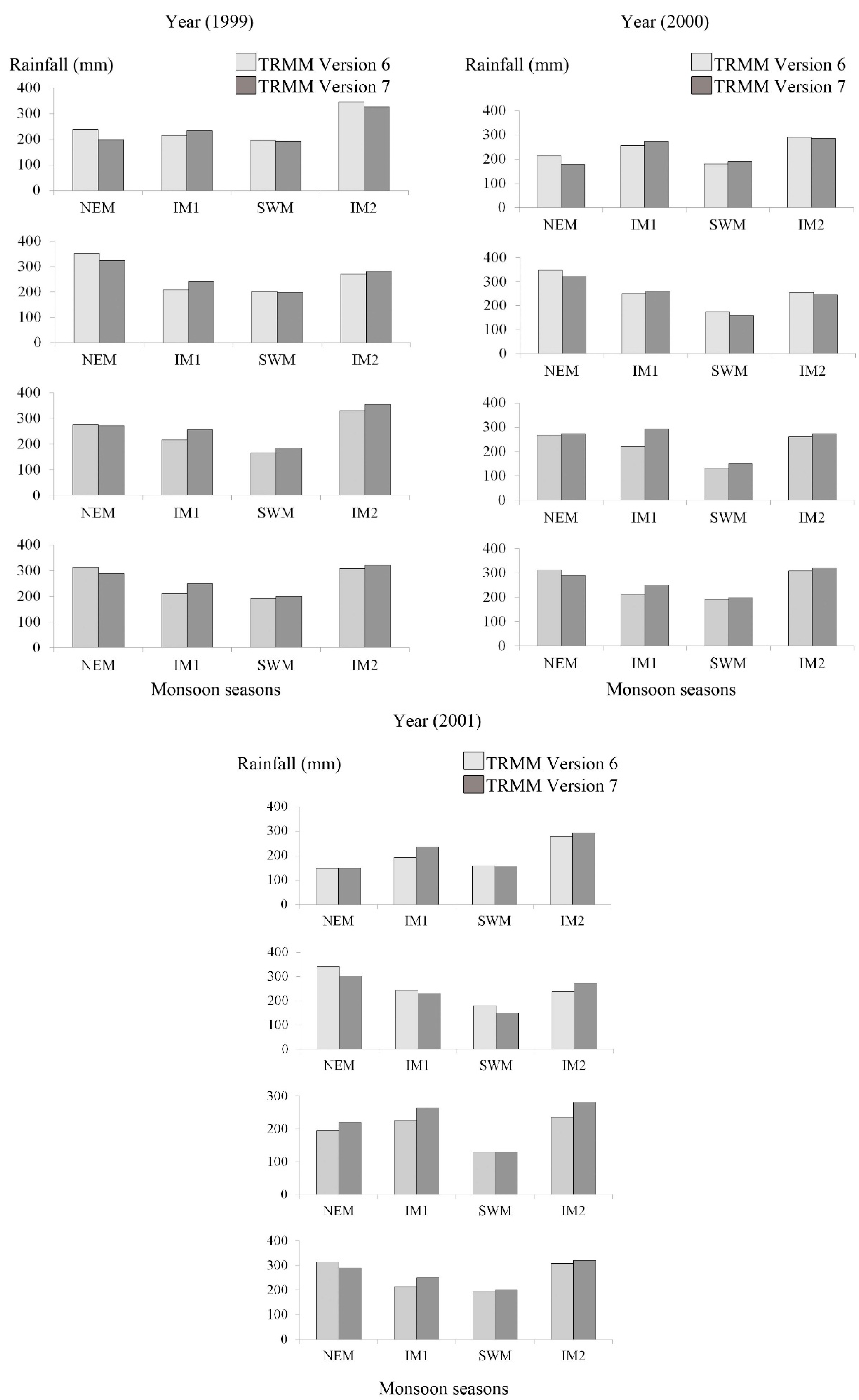 Downscaling should attempt to resolve the uncertainties found in this study. The large error propagated during the wet seasons of IM2 and NEM will lead to inaccurate rainfall estimates that will affect quantitative rainfall estimates. In addition, the low seasonal correlation during the SWM and IM1 will lead to inaccurate temporal monsoon variation prediction from TRMM data. Temporal downscaling is recommended to improve both correlation and measurement differences. For the context of the Asian region, a procedure introduced by Yatagai