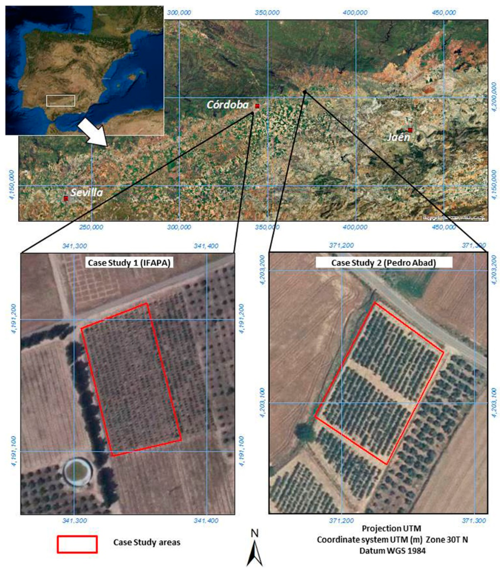 Study area and location of case study areas. Image source: Esri Inc.; PNOA, National Program of Aerial Orthophotograph-Ministerio de Fomento; IFAPA, Institute of Agricultural and Fishery Research and Training.