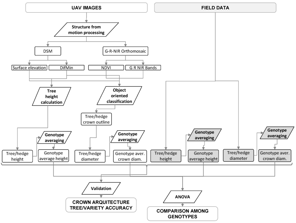 The main steps of the research are summarized in Figure 2. The study was based on the analyses of collections of images acquired by consumer-grade cameras on board UAV platform for two study sites using the SfM image reconstruction approach. As detailed in the following sections, images were processed to obtain digital surface model and color infrared (CIR) orthomosaics. Data were analyzed to estimate tree heights and average crown diameters for the discontinuous canopy in Study Area 1 and hedgerow heights and widths in Study Area 2, respectively. These results were compared against field measures of these variables in order to assess the accuracies of the method, both at the individual tree and hedgerow level for the two study areas. Finally, ANOVA analyses were performed on the tree and hedgerow variables estimated and measured in order to assess the validity of the remote sensing method for comparison among genotypes.