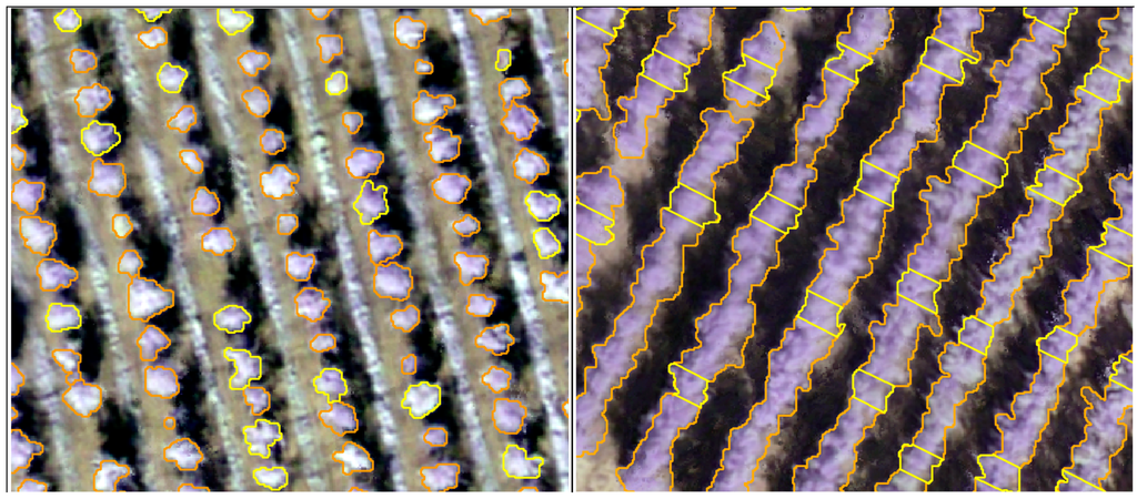 Examples of crown delineation by object-oriented analysis in the Study Area 1 (Left) and Study Area 2 (Right). In yellow, the trees or hedgerow sections, depending on the case, measured in the field and used for the comparison against image estimation of tree parameters.