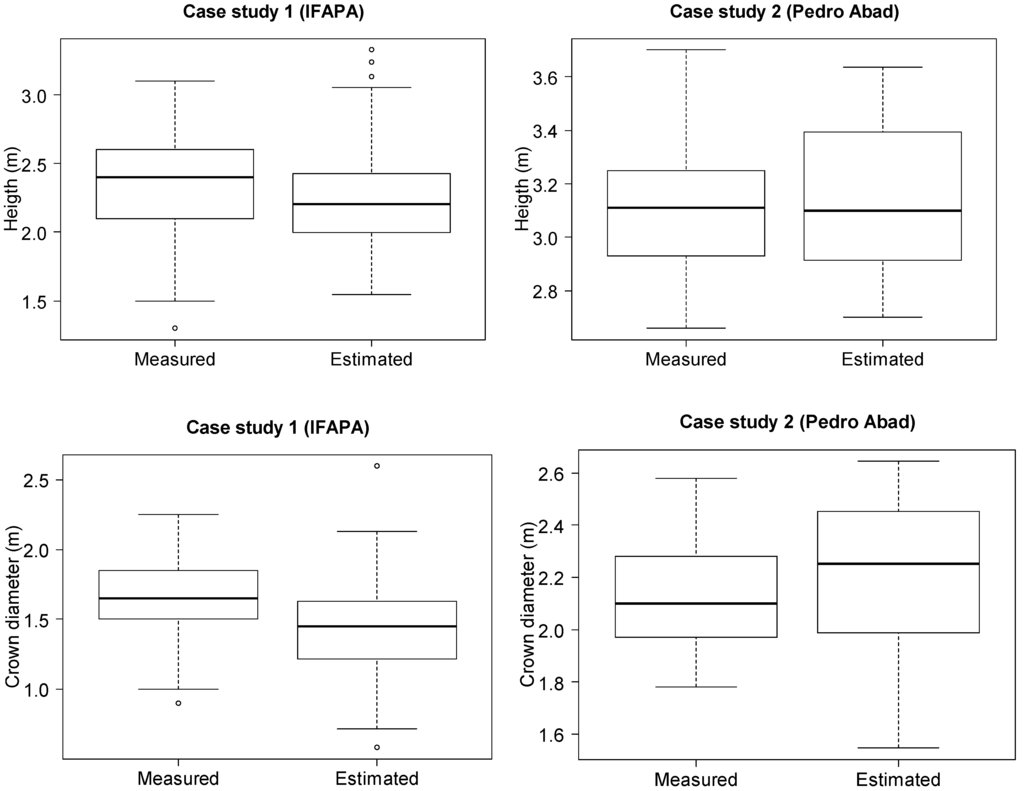 Tree crown delineations were then exported as polygons, and the tree crown diameters were measured using the QGis V 2.2.0 (®Free Software Foundation, Inc., Boston, MA, USA) package. Measures were done following the same protocols as in the field measurements, i.e., cross measurements and averaging for the individual trees in the IFAPA case and width across the rows in the Pedro Abad case.