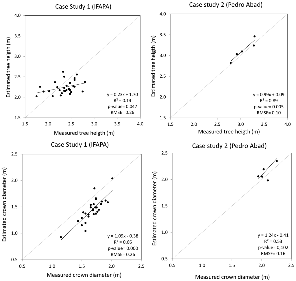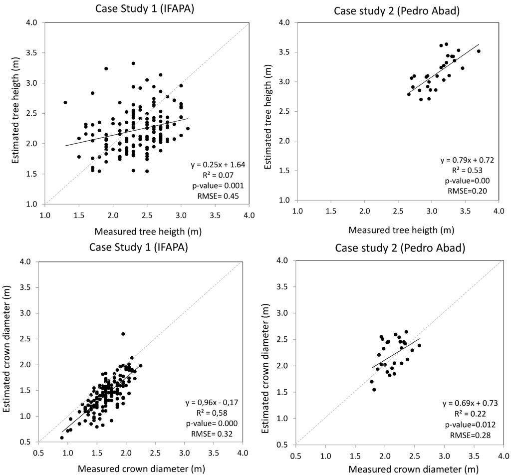 RMSE also varied depending on the study case and variable, with relative errors (compared to the average value measured) ranging from 6.55% to 19.24% (Table 2). While the estimation of height and crown diameters maintained similar relative RMSE in the case of discontinuous canopy (Case Study 1), larger differences were recorded for the site with trees in hedgerows (Case Study 2). As expected from the R2 values mentioned above, the results pointed out a higher agreement between the estimated and measured crown diameter than for the height in the case of discontinuous canopy, while results showed clearly the opposite in the case of trees in hedgerows.