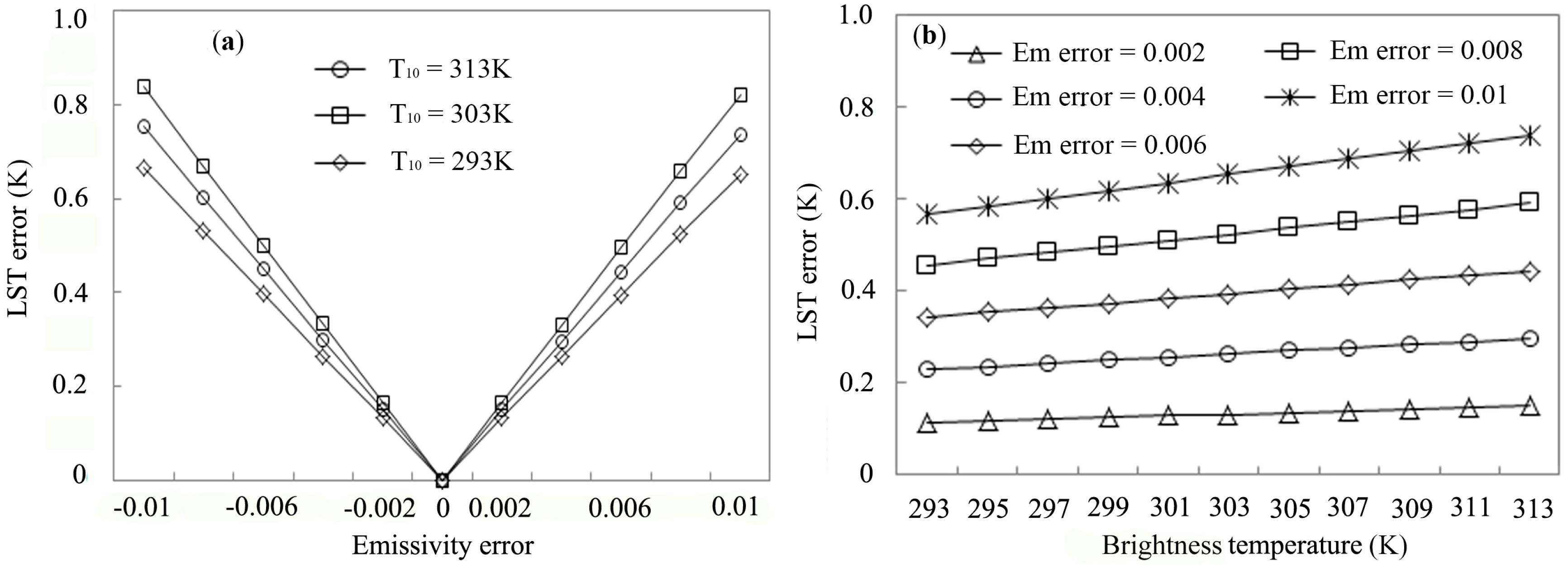 It is very difficult to obtain an accurate estimate of ground emissivity. Such an estimate usually has an error of about ±0.006 for most cases. Results from our sensitivity analysis indicate that such an error in ground emissivity estimation may lead to an error of 0.4 K in LST retrieval by the proposed IMW algorithm. Water vapor content is usually a sensitive parameter in traditional LST retrieval methods. The water vapor content is estimated with an error of ±0.3 g·cm2, which is reasonable for most situations. Additionally, the error of retrieved LST from the water vapor content error is ~1 K. We can conclude that the LST retrieval method is sensitive to water vapor content estimated error. The effective mean atmosphere temperature error is mainly decided by the ratio D10/C10 computed by emissivity and transmission. Additionally, for most situations, the error of retrieved LST from the effective mean atmosphere temperature is ~0.4 K. Thus, it can be said that, under moderate errors in both water vapor content and ground emissivity estimations, the algorithm may be able to have an accuracy of ~1.4 K for LST retrieval.