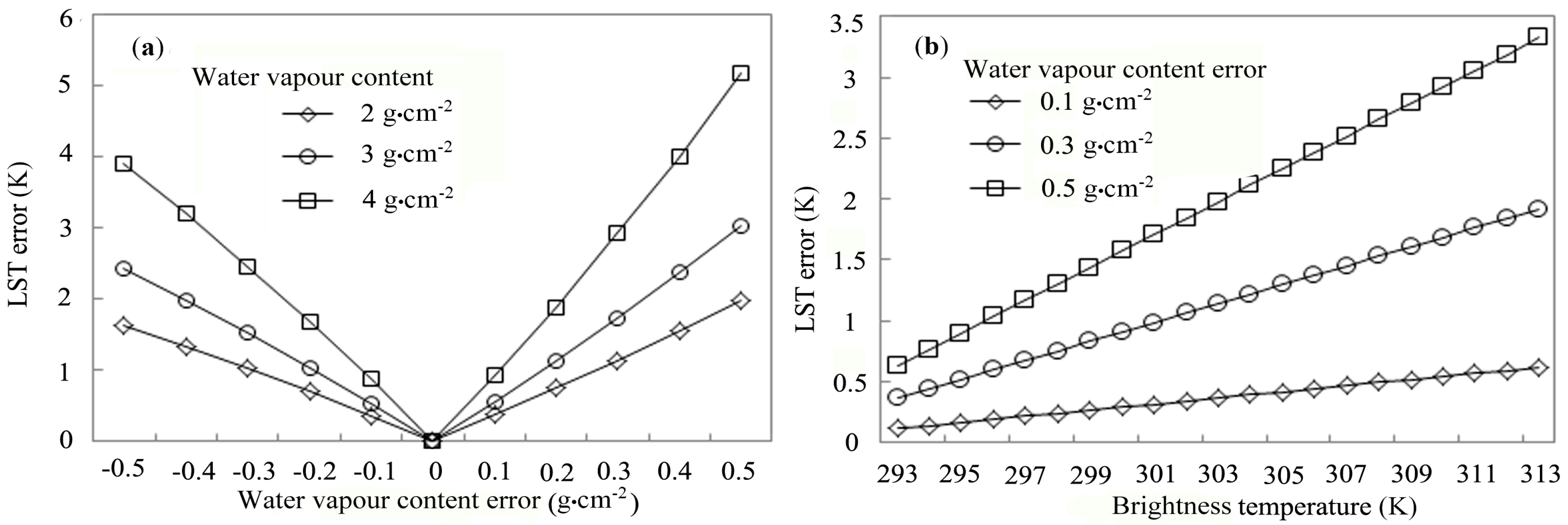 −2 and more than a −4 K LST retrieval error when water vapor content is higher than 3 g·cm