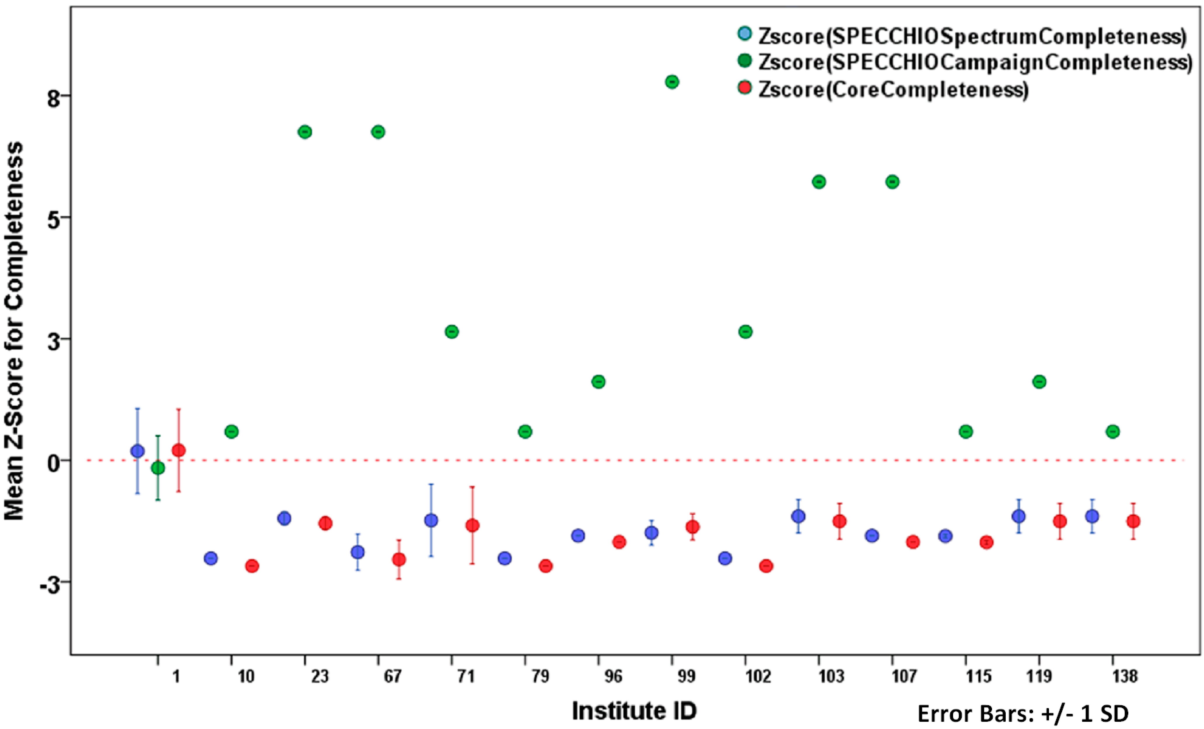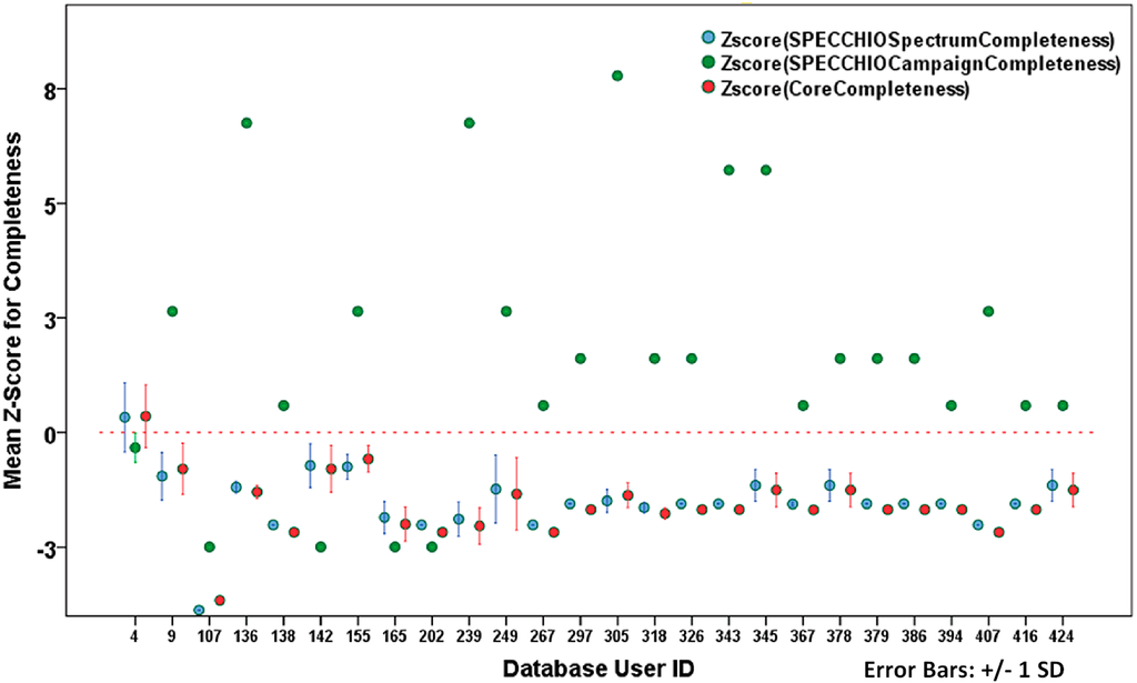 Analysis of variance was one method of determining the effect of user and institute on completeness measures. This was computed on normalized completeness measures using a one-way between subjects ANOVA. Completeness measures used were those for SPECCHIO campaign and spectrum-level metadata, and for the proposed core metadataset. Z-scores were calculated from the raw completeness measures to determine whether they differed across users and institutes. A Z-score quantifies the original completeness values in terms of the number of standard deviations that a given value is from the mean of the distribution. It is useful for identifying any users or institutes which have values below or above the mean. Z-scores above zero indicate that a given user or institute populates metadata to a higher level of completeness than their peers; the reverse is true for Z-scores below zero.