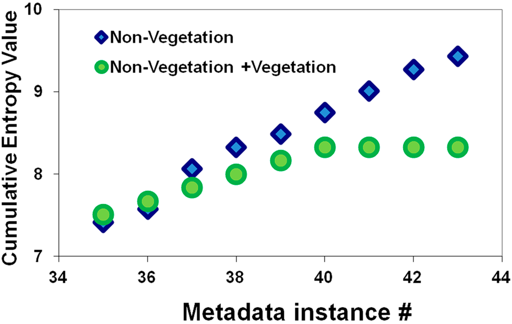 The method of analysis was a comparison of cumulative entropy measurement [34] for the “sample description” text length between vegetation and non-vegetation groups. Text length was used as a measure of how much data users are entering into the sample description. The reasonable assumption was that a larger text length denoted more data. Since there was no pre-defined vocabulary or a baseline set of reference metadata within the USGS Spectral Library against which to verify the kind of information that users should input for “sample description”, text length was the most the suitable measure given the data available.