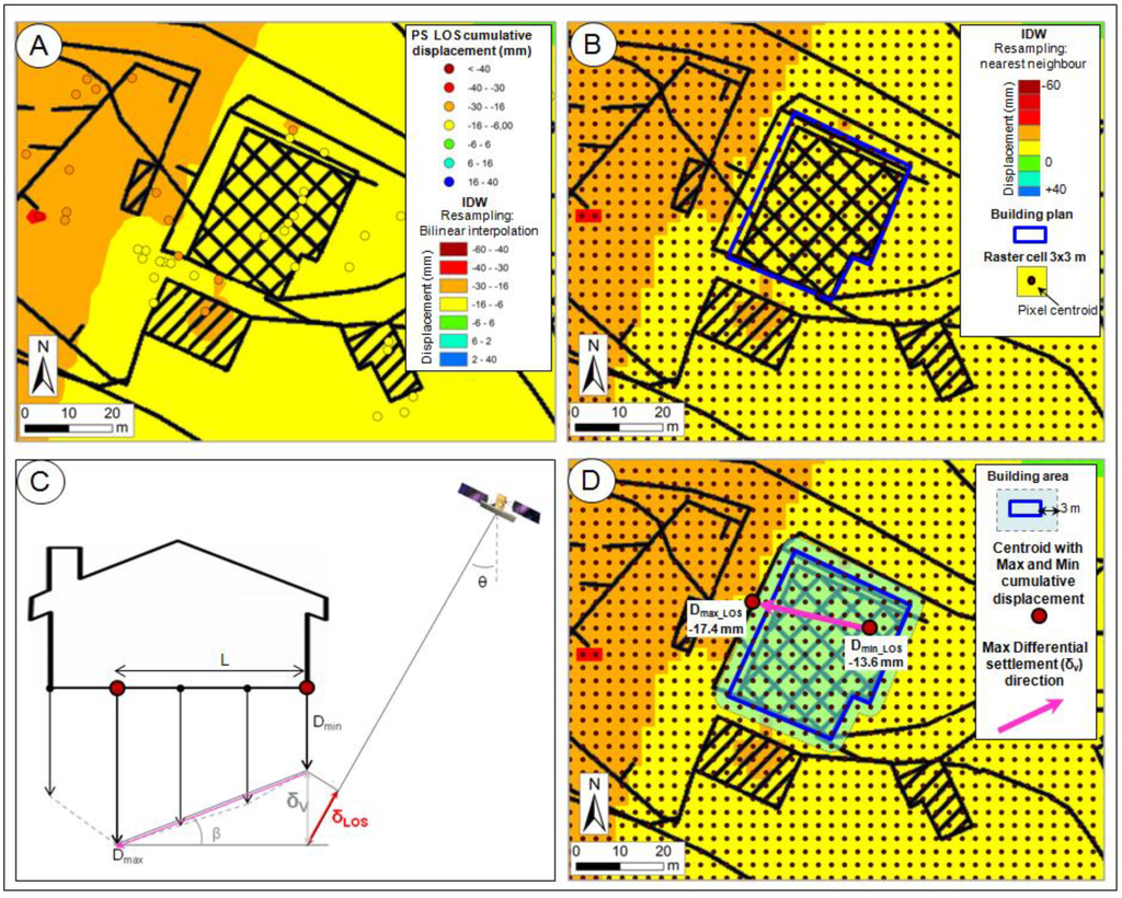 Figure 2. Step by step procedure for building damage characterization and estimation: (A) PSI data and derived IDW surface displayed as bilinear interpolation layered on building boundaries; (B) IDW surface displayed as a nearest-neighbor discrete raster, with pixel centroids obtained for each raster cell; (C) schematic representation of differential settlement parameters used within the analysis; (D) computation of differential settlement direction within an appropriate buffer around the building.