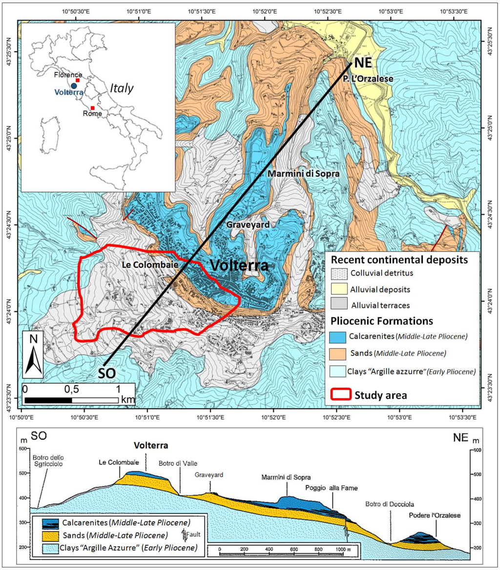 Figure 3. Volterra study area: geological map and section. In order to emphasize the morphology, a vertical exaggeration of 2× is applied to the section. Modified from [34].