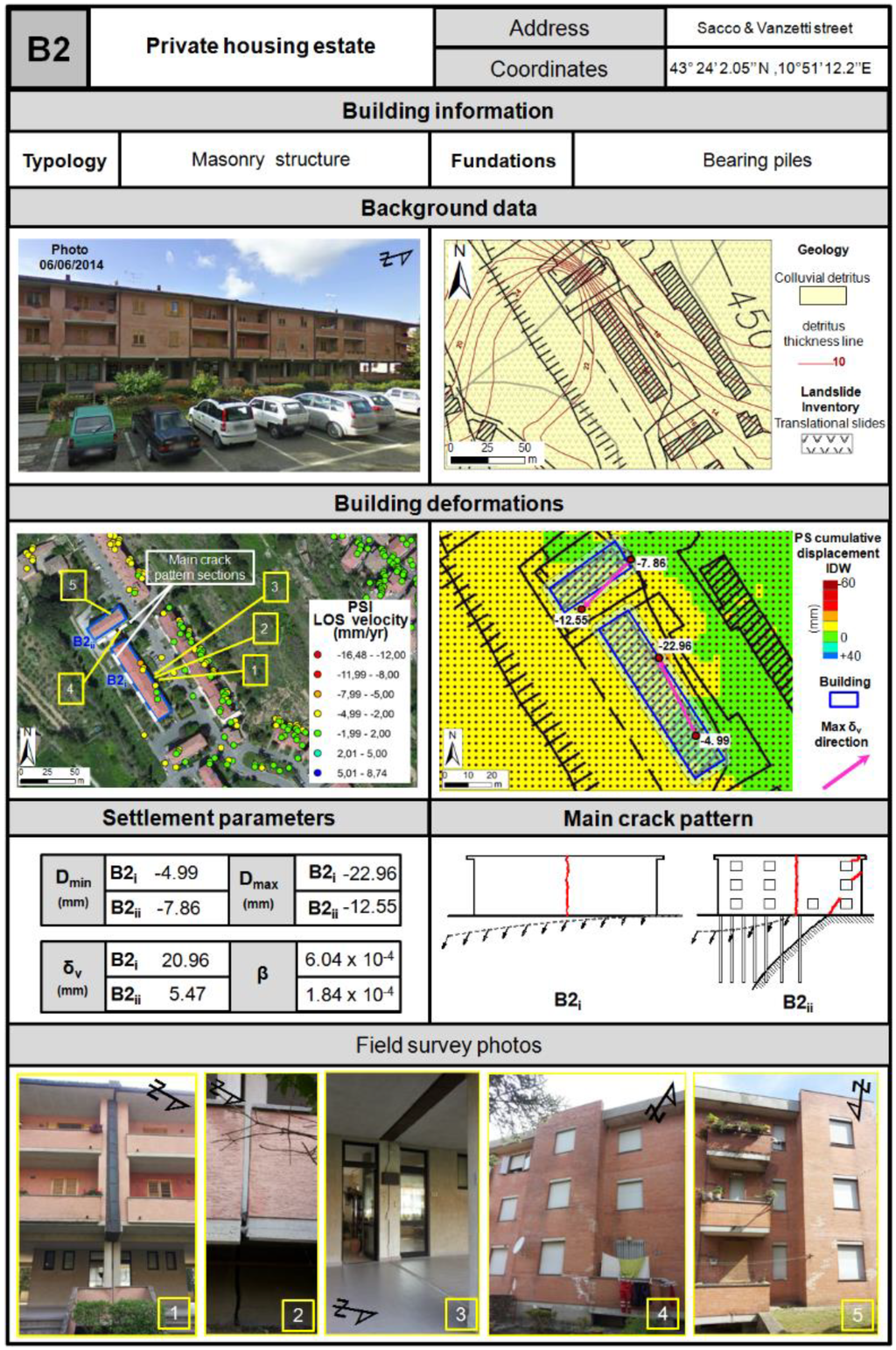 As a result, PSI data, differential settlement parameters and field checks confirm that the whole area is unstable and landsliding, and the higher movements detected towards W-NW of the building B3 within the landslide body could be determined by the higher thickness of the colluvial deposits, which increases the creeping and slope instability.