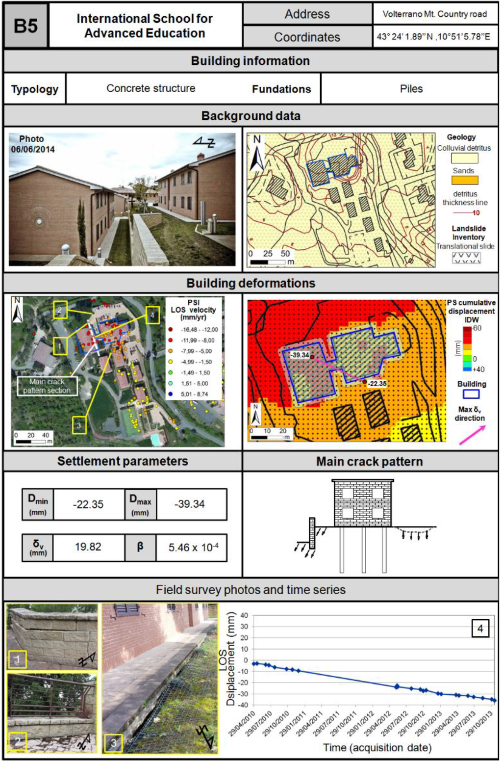 Figure 10. Analysis results of building B5: building information, background data, building deformations, settlement parameters, main crack pattern, some photos of the field survey and a PS time series (the gap during year 2011 is due to missing acquisitions).