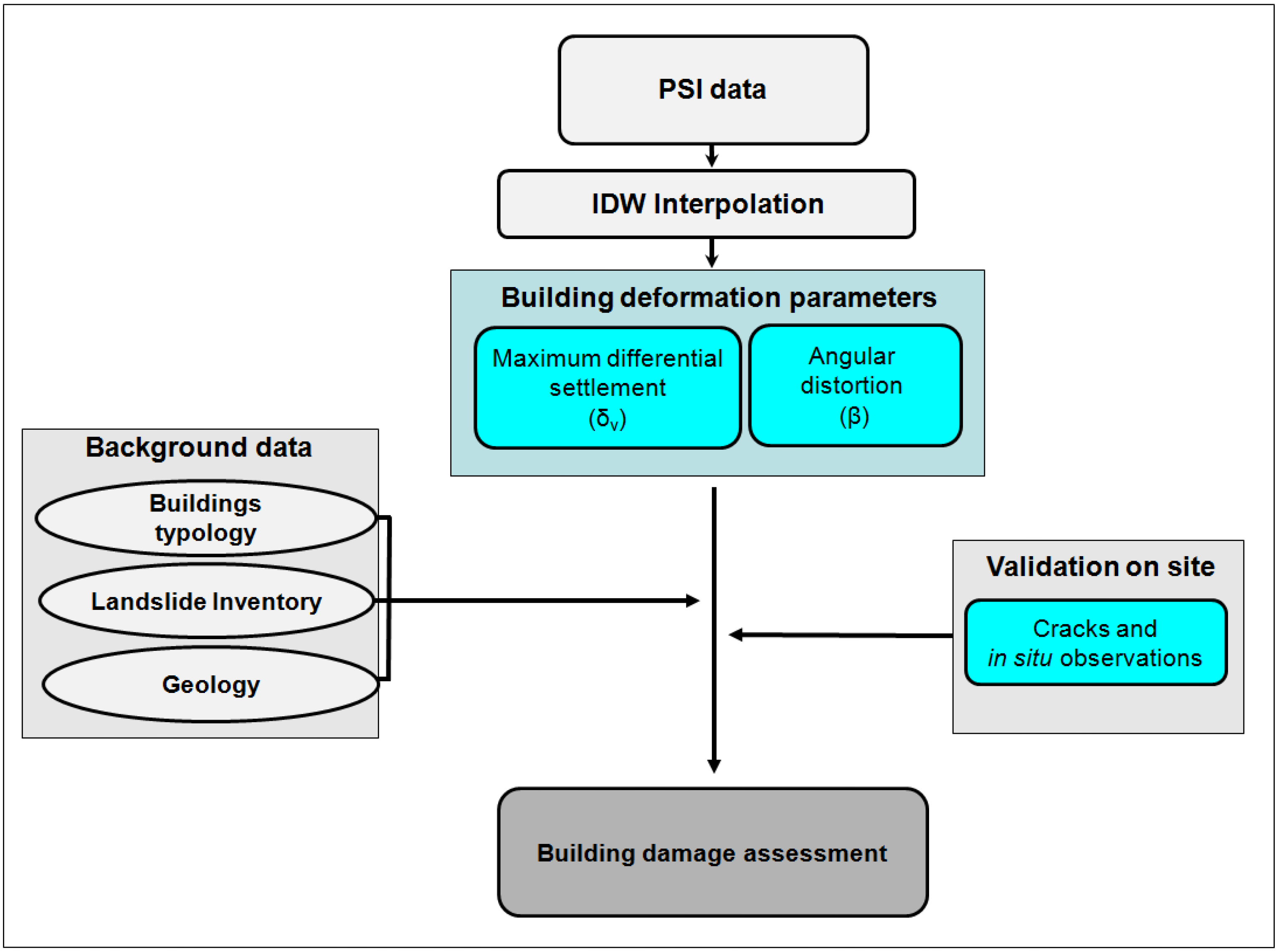 We propose an operative procedure to handle PSI displacement measurements combined with background data (building typology, landslide inventory, geological setting) and on-site evidence, finally leading to a building deformation assessment in the investigated area (Figure 1).