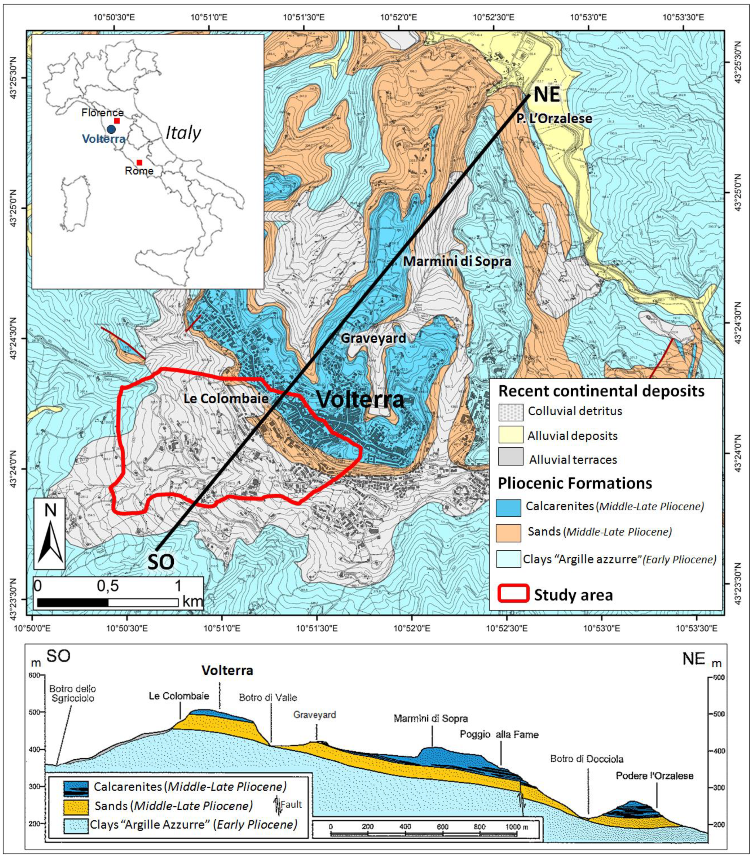 The town of Volterra is located on a tableland at 460–500 meters a.s.l. (above sea level) (Figure 3). The geological setting of the area consists of a Pliocene marine sedimentary succession. The bottom of the stratigraphic sequence is represented by a thickness of marine clays (“Argille Azzurre”) of Early-Middle Pliocene age, overlapped by cemented sandy deposits (“Villamagna sands”). The calcarenites named “Volterra limestones” close the sedimentary succession and lay at the top of the tableland, on which the Volterra city center was built. These three lithological units are stacked in horizontal or sub-horizontal layers, slightly dipping towards northeast, with an inclination that never exceeds 10° [34,35] (Figure 3).