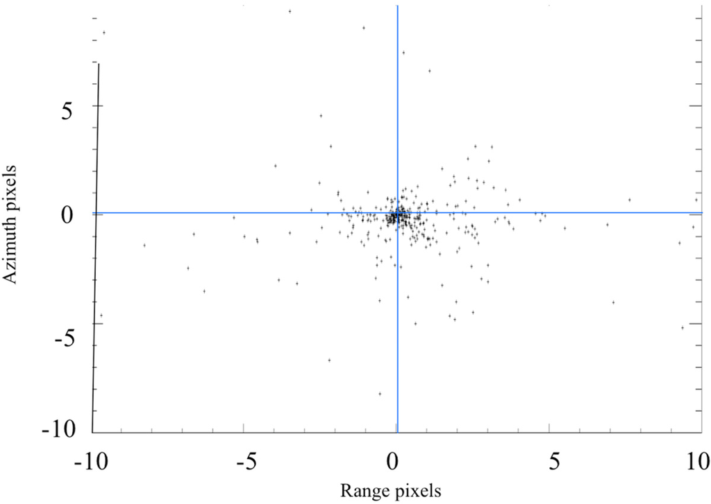 The range and azimuth offsets sampled from 388 UTM grid-zone-projected images prior to correction were examined (see Figure 1). The mean range offset was found to be −0.22 pixels in range, and −0.54 pixels in azimuth, with a standard deviation of over 4 pixels. If we exclude outliers from one particular orbit path in which the offsets were consistently greater than 10 pixels, we found that the mean range offset was 0.34 pixels and the mean azimuth offset was −0.22 pixels, with a standard deviation of about 2 pixels. The range spacing for the path images was 37.5 meters in range and 70 m in azimuth, which led to a mean range offset of 12.8 m ± 82.5 m, and a mean azimuth offset of −15.4 m ± 119 m (excluding RSP424). Although the mean offset was quite small, the offset for each image was not a simple overall range and azimuth shift, but a varying shift in both range and azimuth. To compensate for this variability, a standard 6th order polynomial was fit to the varying range and azimuth offsets and used to correct the varying shift for each UTM grid-zone-projected path image.